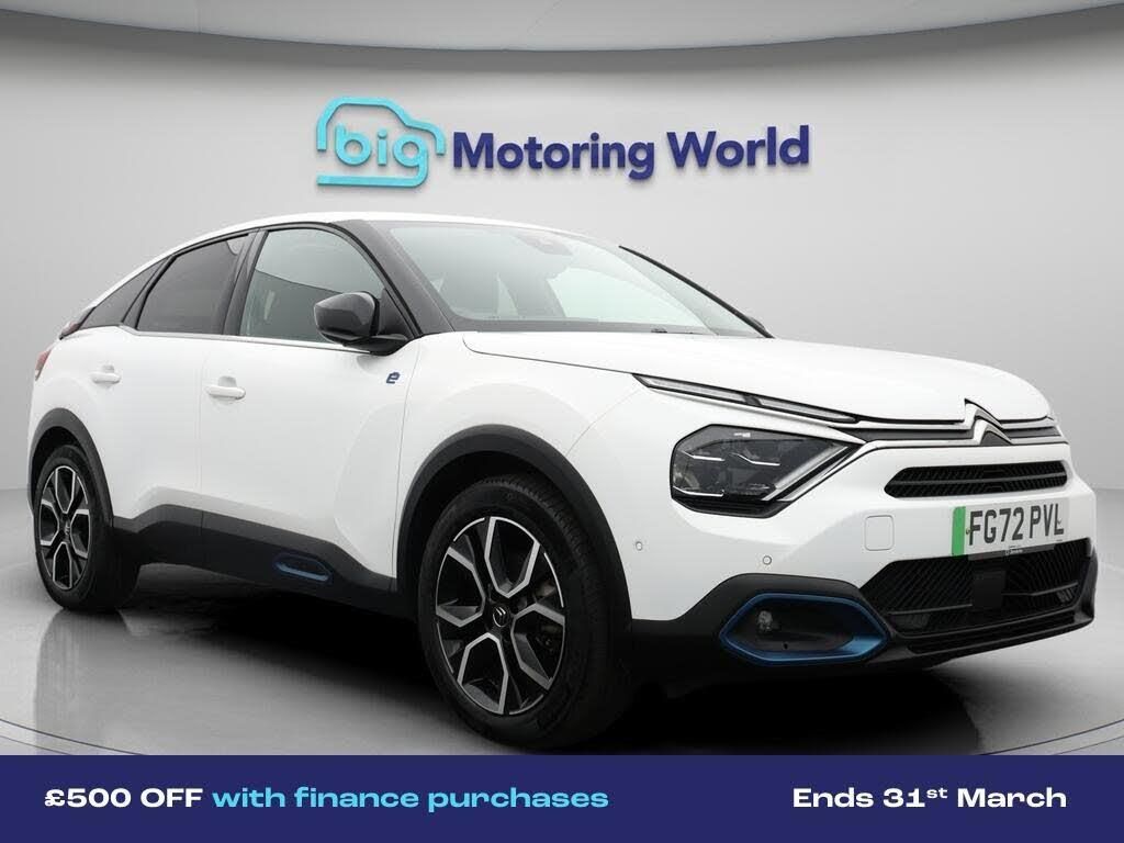 £500 towards your finance depo-Our Citroen e-C4 is finished in White. Specification includes a range of fantastic features including £500 towards your finance deposit, Head up Display, 18'' alloy wheels, Leather Seats, Apple CarPlay, Android Auto, Satellite Navigation, Privacy Glass, Heated Seats, Rear View Camera Specification information is supplied by CAPHPI and may vary to the actual car. This data does not form any part of a buying contact. Please check specification prior to purchase in-store. The MOT is valid until September 2026, visit bigmotoringworld.co.uk for more photos, a 360 tour, service history and a free HPI report.Were BIG on peace of mind and this White Citroen e-C4 has completed our comprehensive 200 point inspection and passed all checks. Its ready for you to drive away with immediate collection in-store. We include a 90-day warranty as standard plus an option to extend for up to 3 years.Reserve this car exclusively for you, safely and securely at bigmotoringworld.co.uk, with a fully refundable £99 deposit. Test drive before you buy, with no commitment, no hassle and a completely haggle free experience. Still searching and want to see thousands more cars? We are BIG on choice with over 8000 cars to choose from.Visit our award winning web site bigmotoringworld.co.uk.Were Big Motoring World and were BIG on what matters to you.