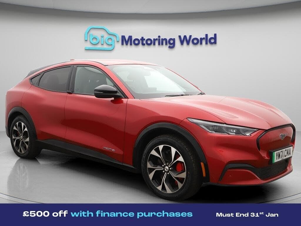 £500 towards your finance depo-Our Ford Mustang Mach-E comes with optional extras worth £1,150. Specification includes a range of fantastic features including £500 towards your finance deposit, All Wheel Drive, 19'' Alloy wheels, Leather Seats, Apple CarPlay, Adaptive Cruise Control, Bang & Olufsen Speakers, Satellite Navigation, Ford SYNC, Privacy Glass Specification information is supplied by CAPHPI and may vary to the actual car. This data does not form any part of a buying contact. Please check specification prior to purchase in-store. The MOT is valid until February 2027, visit bigmotoringworld.co.uk for more photos, a 360 tour, service history and a free HPI report.Were BIG on peace of mind and this Red Ford Mustang Mach-E has completed our comprehensive 200 point inspection and passed all checks. Its ready for you to drive away with immediate collection in-store. We include a 90-day warranty as standard plus an option to extend for up to 3 years.Reserve this car exclusively for you, safely and securely at bigmotoringworld.co.uk, with a fully refundable £99 deposit. Test drive before you buy, with no commitment, no hassle and a completely haggle free experience. Still searching and want to see thousands more cars? We are BIG on choice with over 8000 cars to choose from.Visit our award winning web site bigmotoringworld.co.uk.Were Big Motoring World and were BIG on what matters to you.