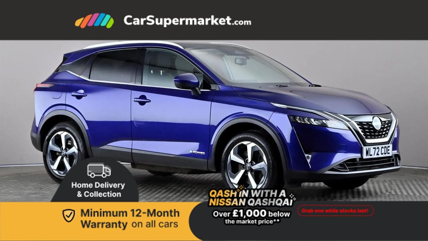 Apple CarPlay, Android Auto, Blind Spot Monitoring, Parking Sensors, Cruise Control, Lane Departure Warning, Sat Nav, Traffic Sign Recognition, Bluetooth, Privacy Glass, Automatic Climate Control, 18" Alloy Wheels;Nissan Qashqai 1.5 E-Power N-Connecta Auto - Blue. Apple CarPlay, Android Auto, blind spot monitoring, satellite navigation, privacy glass, 18" alloy wheels and glass roof. Last serviced 07/10/2025 with full service history. MOT due: 27/01/2027
