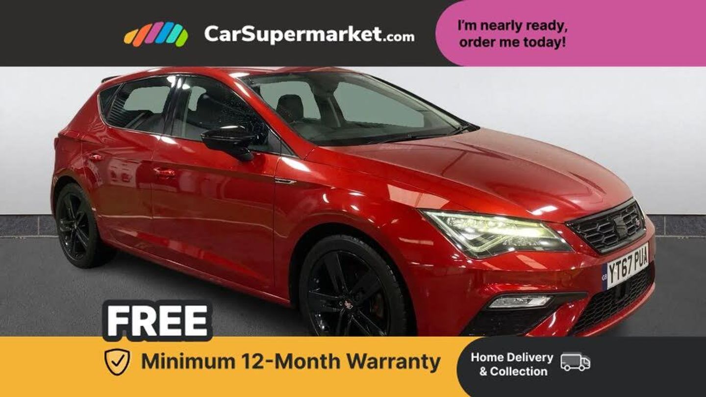 'Lights On' Reminder warning buzzer,8" touch screen,Bluetooth Handsfree Phone Connection,Low fuel warning light,Outside temperature gauge,Remote fuel flap release,SEAT Drive profile,SEAT logo boot release,Service interval indicator,Touch screen display,Trip computer,Voice control system,XDS electronic differential lock,2 USB ports,2x SD card slot,Auxiliary input socket,Bluetooth audio streaming,DAB Digital radio,Radio/CD + MP3,Steering wheel mounted audio/phone controls,Aluminium front door sills,Black grille with chrome surround,Body colour door handles,Body coloured bumpers,Body coloured door mirrors,Dark tinted rear windows,Electric adjustable/heated/folding door mirrors,Electric front/rear windows with one touch/auto up/down,Electric headlamp adjustment,High gloss black finish B and C pillars,LED indicators in door mirrors,Rear wash/wipe,Reverse activated kerb-view adjustment on passenger's door mirror,Twin exhaust pipes,12v power point in centre console,3 height adjustable rear headrests,60/40 split folding rear seat,Active head restraints,Additional heating and ventilation outlet in rear of centre console,Ambient lighting,Boot net,Driver seat lumbar adjustment,Driver/passenger sunvisors with illuminated vanity mirrors,Dual zone climate control,Dust/pollen filter,Front adjustable head restraints,Front armrest with storage box,Front cupholders x 2,Front map reading lights,Front seat and rear pockets,Front sports seats,Height/reach adjust steering wheel,Illuminated glovebox,Illuminated rear centre console,Instrument lighting with brightness control,Leather handbrake,Luggage tie-down hooks,Passenger seat height adjuster,Passenger seat lumbar adjust,Perforated leather steering wheel with red stitching + gear knob,Rear reading lights,Rear top tether child seat ISOFIX attachment,Steering wheel gearshift paddles,Full LED headlight pack - Leon,3 point seatbelts on all rear seats,ABS + traction control,Child proof door locks,Collision mitigation braking system,Curtain airbags,Driver/Front Passenger airbags,Drivers knee airbag,Electronic parking brake with auto hold,ESP+EBA,Front seatbelt pretensioners,Front Seatbelt warning,Front side airbags,Hill hold control,Manual passenger airbag deactivation function,Tyre pressure monitoring system,Engine immobiliser,Locking wheel bolts,Remote central locking + deadlocks,Volumetric alarm with back up horn,Chrome interior trim