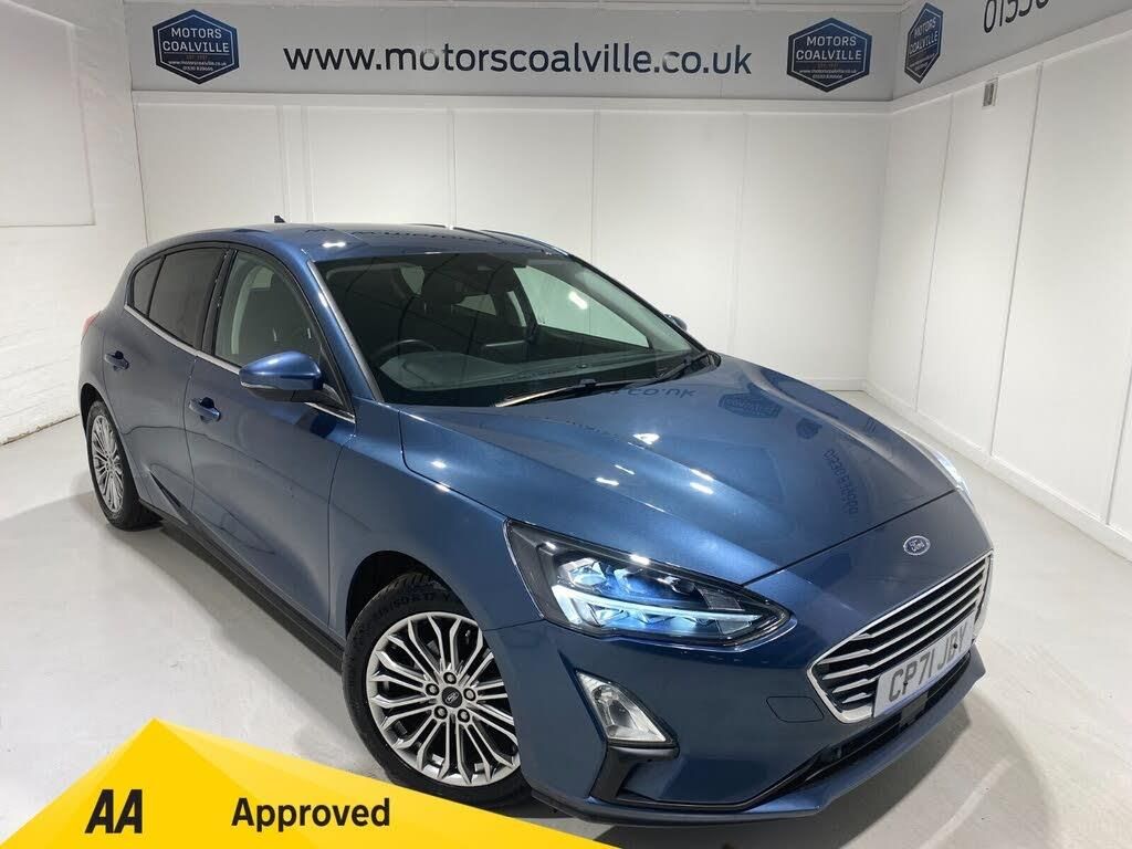 2022 71 Reg Ford Focus 1.0 Ecoboost mHEV (125PS) TITANIUM X EDITION 6 spd Manual 5dr. Chrome Blue metallic with Ebony Sensico PART LEATHER interior, HEATED FRONT SEATS and HEATED STEERING WHEEL, drivers 4-way electric seat adjust, TOUCHSCREEN SYNC3 SATELLITE NAVIGATION, FULL LED HEADLAMPS, 17 inch alloys, KEYLESS ENTRY, POWER FOLDING DOOR MIRRORS with puddle lights, front and rear parking sensors, wireless charging, front fog lamps with cornering function, DEATC AIR CON, Lane Keeping aid with lane keeping alert, electric park brake with auto hold, Auto lights, wipers & auto dimming rear view mirror, Power start button, Hill start, trip computer, ESP, Quick clear front screen, Thatcham Cat 1 alarm, 13,316 miles (CP 71 JBY).