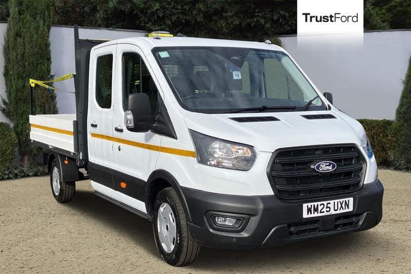 HILL START ASSIST temporarily stops you rolling backwards or forwards when making a hill start - maintaining pressure to the braking system for an extra 25 seconds giving you more time and control as you move your foot from the brake to the accelerator, CPD Conspicuity Tape & Red Door Lozenges, Front air conditioning with electric automatic temperature control (EATC), 4 Fixing points in the side rave either side of the vehicle, Single Level Fall Arrest StrapsAVAILABLE, Wireless Apple CarPlay and Android Auto, Door mirrors - Blind spot eliminator and integrated side indicator, Electric power assisted steering (EPAS), Quickclear heated windscreen, Driver's airbag, Recirculation heater, Anti-lock braking system (ABS) with electronic brake-force distribuition (EBD), Automatic front wipers with rain sensor, Trip computer, Warning lights, Key operated bonnet release, Reach and rake adjustable steering column, Audio controls mounted on steering wheel, 2 x 12V power outlets, Part body colour front bumper, Vehicle maintenance monitor, Front door map pockets, Curve control, Hill start assist, Gearshift indicator light, Front side and curtain airbags, High mounted LED downlighter, Ford Easy Fuel capless refuelling system with misfuel inhibit, Daytime running lights, Low roof line, 4-Spoke Sensico trimmed steering wheel, Collision mitigation system, Front independent MacPheron struts, gas pressured shock absorbers and rear leaf springs, Driver seatbelt pre-tensioner, Electronic dynamic cornering control, Rear axle Alt A - Narrow track, Emergency brake assist, Roll stability control, Side wind mitigation, Tablet holder, Intelligent Speed Assist, Emergency assistance, Visible Vehicle Identification Number (VIN), Underseat storage compartment (Under dual passenger seat), Overhead console, 4 Front speakers (2 woofers and 2 tweeters), Immobiliser - Safeguard passive anti-theft system (PATS), audible signal if a door is ajar when locking activated, Header mounted courtesy lights front with theatre dimming and map reading lights, Emergency brake warning, AdBlue aftertreatment system - 24 Litre, Rear fog lamps, Electronic Stability Control (ESC), Tyre pressure monitoring system, Electric windshield defroster, Driver one touch up/down power windows, Lockable glovebox with lid and A 4 file storage capability, Driver and passenger seatbelt reminder, Non limited slip differential front axle, Brakes - ESP/HLA/FBS, Side marker lamps, Day/Night inside mirror, Quad beam headlamps, Complete tinted glass, Unperforated cab back panel, Wrong way alert, Start/stop system, Less load compartment loops, Multi stage vehicle, Exhaust exit behind muff down, 8 Part digital instrument cluster, Adaptive front lighting system, Front axle rating - 1850KG, Self colour door handles, Self colour front grille, Automatic on/off headlights, linear rate coil springs, stabiliser bar, Battery - Cold start function (-20 degree C), Twin, 2 litre bottle capacity, fascia mounted bottle holder, Driver's side storage compartment on facia top, Driver's side sunglasses storage, Roof mounted fin antenna, 2-way head restraints on front seats, Load adaptive control, Front passenger's airbag including airbag deactivation switch, 3-point diagonal inertia reel seatbelts for all front seats, Configurable unlocking - 2-Stage unlocking, Audio mis-lock feedback, Auto locking on drive away, doors automatically lock at 5 mph, Remote control central locking with 1 key fob, Power central locking, Power door deadlocks, shielded with strengthened mouldings, Dual circuit front and rear discs with self adjusting servo assistance, Cab easy clean rubber floor covering, Cab moulded headlining, Water in fuel filter sensor, Selectable drive modes - Normal, Slippery and Eco, Wide self colour bodyside mouldings, LONG WHEEL BASE, Double Chassis Cab, ULEZ COMPLIANT, ULEZ, NATIONWIDE DELIVERY, EURO 6, CPD CONVERSION, LED BEACON MINI LIGHTBAR, AIR CON, CHAPER 8 CHEVERON BOARD