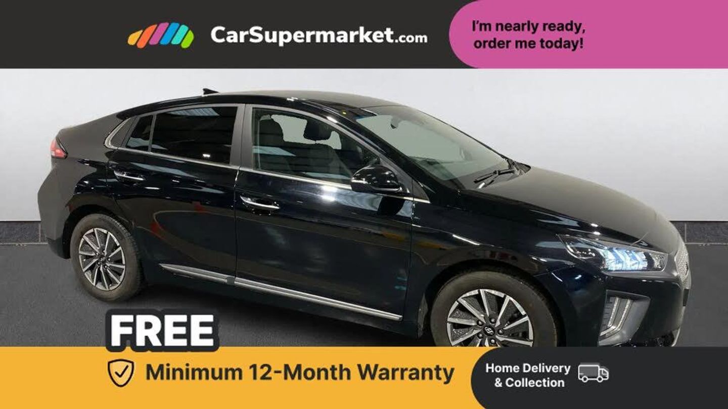 10.25" touchscreen satellite navigation includes traffic messaging channel, mapcare, live services and bluelink,Adaptive cruise control with Stop and Go,Apple car play/Android Auto,Bluetooth system,Driver attention alert system,E-call,Eco driving assistant system (ECO DAS),Electric power steering with variable drive modes,Gear lever drive mode selector,Lane departure warning system with lane keep assist - LKAS,Parking system with rear camera and guidance system,Rear parking sensor,Rear view monitor,Roadside assistance,Supervision cluster with 7" high resolution TFT LCD,Voice recognition,Windscreen washer fluid sensor and warning indicator,Wireless phone charging pad,7 pin charging cable,7.2 kw On board Charger,Emergency 3 pin connector charging cable (ICCB),DAB Digital radio,Infinity sound system includes 1 centre, 2 tweeters, 2 front, 2 rear and 1 ext amp,Radio data system,Steering wheel audio, phone and cruise controls,USB and aux connection in front,Active air flap radiator grille,Auto dimming rear view mirror,Automatic defog system for front windscreen,Automatic headlights with dusk sensor,Automatic windscreen wipers with rain sensor,Body colour bumpers,Body colour door handles,Body colour door mirrors,Bodyside mouldings,Chrome door scuff with ioniq logo,Chrome finish window surround,Door mirror puddle lights,Electric adjustable door mirrors,Electric front windows - anti trap + one touch,Electric heated door mirrors,Grey radiator grille,Heated rear windscreen,High beam assist,LED daytime running lights,LED Headlights,LED indicators in door mirrors,LED rear fog light,Positioning Lights - LED,Power folding door mirrors,Rear electric windows,Rear LED lights,Rear roof spoiler with integrated LED brake light,Solar glass with windscreen shade band,Tinted windows,Two tone rear bumper,12V power outlets,60/40 split folding rear seat,Air conditioning driver only mode,CCS Combo rapid charge port (50kW),Centre console storage,Centre interior light,Chrome interior door handles,Cloth upholstery,Driver seat height adjust,Driver's electric adjustable lumbar support,Driver/passenger sunvisors with illuminated vanity mirrors,Front centre armrest with storage compartment,Front cupholder,Front head restraints with vertical and horizontal adjustment,Front seat and rear pockets,Heated front seats,Heated steering wheel,Illuminated luggage compartment,Interior mood lighting,Leather wrapped steering wheel,Luggage net,Manual height adjustable front passenger seat,Map and reading lights,Paddle shifter,Rear centre console with air vents,Single zone climate control,Sunglasses holder,USB - driver arm rest (charging only),Vertical adjustment rear head restraints,3x3 point rear seatbelts,Airbags - front, front side, curtain and drivers knee airbags,Anti-lock brake system (ABS),Autonomous emergency braking,Electric parking brake with auto hold function,Electronic stability control,Front passenger airbag deactivation switch,Hill start assist control (HAC),Regenerative braking system,Traction control,Tyre pressure monitoring system with individual tyre pressure display,Deadlocks,Immobiliser,Keyless smart entry with push button start,Remote central locking,16" alloy wheels,Tyre repair kit,Rear side wing doors,Rear wiper,Variable front intermittent wipers,3 rear seats,Single front passenger seat,Manual child lock in rear doors,Phantom Black