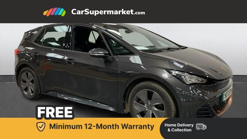 5.3" digital cockpit with 12" central display infotainment system,Bluetooth without wireless charger,Driving profile selection - Range, Comfort, Performance, Individual,Dynamic steering,Emergency steering support with turn assist,Forward collision warning with automatic braking,Front/rear park distance control,Lane assist,PAS,Tailgate,Voice assistant,Wireless full link smartphone integration,120kW DC charging capacity,Shock absorption in front,Sports rear shock absorption,2x USB sockets in front,2x USB sockets in rear, charge only,DAB (Digital Audio Broadcasting) and AM/FM radio,Acoustic windshield,Auto dimming rear view mirror,Daytime running lights,Electric adjustable/heated/folding door mirrors,Full LED headlights,Grey exterior mirrors,Heat insulated glass,LED 3rd brake light,LED rear lights,Rear side wing doors,Rear wiper,Transport protection film,Variable intermittent wiper,Welcome home function and adverse weather function,Windshield wiper with light/rain sensor,3 seat bench in 2nd row,Aluminium pedals,CUPRA emblem on steering wheel,Dual zone climate control,Electric auxiliary air heater,Heated leather wrapped multi function steering wheel,Integrated front head restraints,ISOFIX points in outer rear seats with top tether anchorage points,Manual height adjustable front seats,Multi-colour ambient interior lighting,Rear headrests,SEAQUAL Yarn cloth upholstery,Single front passenger seat,Sunvisors with illuminated mirror,Unsplit rear seat bench, split folding backrest, without centre armrest,3 point seatbelts on all rear seats,Driver and front passenger airbags with front passenger airbag deactivation, side airbag in front with curtain airbag and front interaction airbag,Extended safety system with proactive passenger protection system,Manual child lock in rear doors,Public e-call,Tiredness recognition system, driver alert system,Tyre pressure monitoring system,Visual and acoustic seat belt reminder,Anti theft alarm system with interior monitoring in cab, backup horn and towing protection,Anti theft wheel bolts,Keyless go central locking system,18" Cyclone alloy wheels,Tool kit,Tyre repair kit
