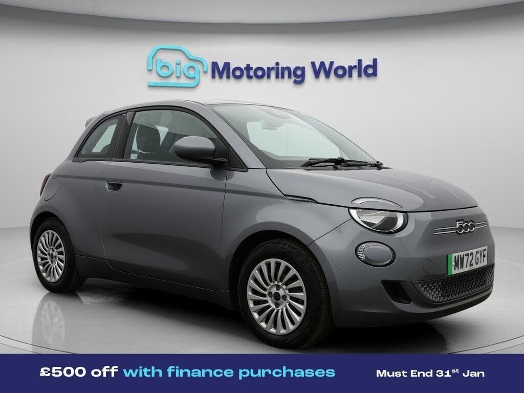 £500 towards your finance depo-Our Fiat 500e comes with optional extras worth £600. Specification includes a range of fantastic features including £500 towards your finance deposit, Apple CarPlay, Internet, Bluetooth, Parking Sensors, Cruise Control, Climate Control, Keyless Go, DAB Radio , Touch Screen Control Specification information is supplied by CAPHPI and may vary to the actual car. This data does not form any part of a buying contact. Please check specification prior to purchase in-store. The MOT is valid until January 2027, visit bigmotoringworld.co.uk for more photos, a 360 tour, service history and a free HPI report.Were BIG on peace of mind and this Grey Fiat 500e has completed our comprehensive 200 point inspection and passed all checks. Its ready for you to drive away with immediate collection in-store. We include a 90-day warranty as standard plus an option to extend for up to 3 years.Reserve this car exclusively for you, safely and securely at bigmotoringworld.co.uk, with a fully refundable £99 deposit. Test drive before you buy, with no commitment, no hassle and a completely haggle free experience. Still searching and want to see thousands more cars? We are BIG on choice with over 8000 cars to choose from.Visit our award winning web site bigmotoringworld.co.uk.Were Big Motoring World and were BIG on what matters to you.