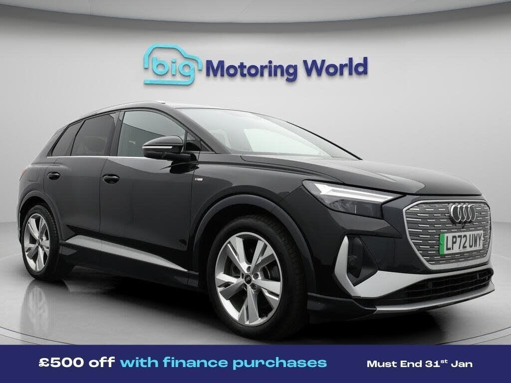 £500 towards your finance depo-Our Audi Q4 e-tron is finished in Black. Specification includes a range of fantastic features including £500 towards your finance deposit, Part Leather Seats, Lane Assist, S Line Body Styling, Privacy Glass, Heated Seats, Bluetooth, Parking Sensors, Audi Connect, 3 Zone Climate Specification information is supplied by CAPHPI and may vary to the actual car. This data does not form any part of a buying contact. Please check specification prior to purchase in-store. The MOT is valid until February 2027, visit bigmotoringworld.co.uk for more photos, a 360 tour, service history and a free HPI report.Were BIG on peace of mind and this Black Audi Q4 e-tron has completed our comprehensive 200 point inspection and passed all checks. Its ready for you to drive away with immediate collection in-store. We include a 90-day warranty as standard plus an option to extend for up to 3 years.Reserve this car exclusively for you, safely and securely at bigmotoringworld.co.uk, with a fully refundable £99 deposit. Test drive before you buy, with no commitment, no hassle and a completely haggle free experience. Still searching and want to see thousands more cars? We are BIG on choice with over 8000 cars to choose from.Visit our award winning web site bigmotoringworld.co.uk.Were Big Motoring World and were BIG on what matters to you.