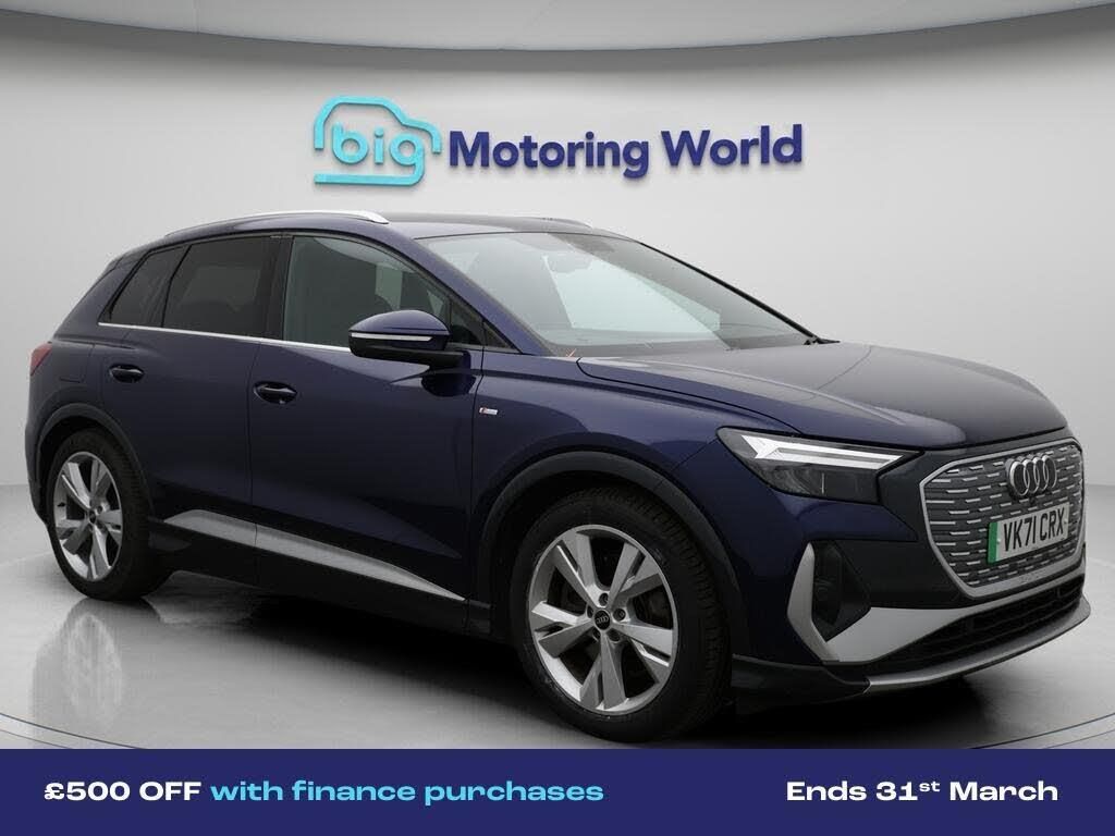 £500 towards your finance depo-Our Audi Q4 e-tron is finished in Blue. Specification includes a range of fantastic features including £500 towards your finance deposit, Leather Seats, Apple CarPlay, Lane Assist, S Line Body Styling, Android Auto, Satellite Navigation, Privacy Glass, Heated Seats, Rear View Camera Specification information is supplied by CAPHPI and may vary to the actual car. This data does not form any part of a buying contact. Please check specification prior to purchase in-store. The MOT is valid until September 2026, visit bigmotoringworld.co.uk for more photos, a 360 tour, service history and a free HPI report.Were BIG on peace of mind and this Blue Audi Q4 e-tron has completed our comprehensive 200 point inspection and passed all checks. Its ready for you to drive away with immediate collection in-store. We include a 90-day warranty as standard plus an option to extend for up to 3 years.Reserve this car exclusively for you, safely and securely at bigmotoringworld.co.uk, with a fully refundable £99 deposit. Test drive before you buy, with no commitment, no hassle and a completely haggle free experience. Still searching and want to see thousands more cars? We are BIG on choice with over 8000 cars to choose from.Visit our award winning web site bigmotoringworld.co.uk.Were Big Motoring World and were BIG on what matters to you.