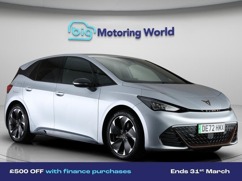 £500 towards your finance depo-Our CUPRA Born is finished in Silver. Specification includes a range of fantastic features including £500 towards your finance deposit, Head up Display, 19'' Alloy wheels, Apple CarPlay, Lane Assist, Android Auto, Satellite Navigation, Privacy Glass, Heated Seats, Rear View Camera Specification information is supplied by CAPHPI and may vary to the actual car. This data does not form any part of a buying contact. Please check specification prior to purchase in-store. The MOT is valid until September 2026, visit bigmotoringworld.co.uk for more photos, a 360 tour, service history and a free HPI report.Were BIG on peace of mind and this Silver CUPRA Born has completed our comprehensive 200 point inspection and passed all checks. Its ready for you to drive away with immediate collection in-store. We include a 90-day warranty as standard plus an option to extend for up to 3 years.Reserve this car exclusively for you, safely and securely at bigmotoringworld.co.uk, with a fully refundable £99 deposit. Test drive before you buy, with no commitment, no hassle and a completely haggle free experience. Still searching and want to see thousands more cars? We are BIG on choice with over 8000 cars to choose from.Visit our award winning web site bigmotoringworld.co.uk.Were Big Motoring World and were BIG on what matters to you.