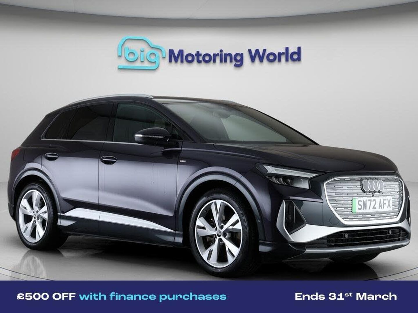 £500 towards your finance depo-Our Audi Q4 e-tron is finished in Purple. Specification includes a range of fantastic features including £500 towards your finance deposit, Part Leather Seats, Premium Sound System, Lane Assist, S Line Body Styling, Satellite Navigation, Privacy Glass, Heated Seats, Rear View Camera, Bluetooth Specification information is supplied by CAPHPI and may vary to the actual car. This data does not form any part of a buying contact. Please check specification prior to purchase in-store. The MOT is valid until October 2026, visit bigmotoringworld.co.uk for more photos, a 360 tour, service history and a free HPI report.Were BIG on peace of mind and this Purple Audi Q4 e-tron has completed our comprehensive 200 point inspection and passed all checks. Its ready for you to drive away with immediate collection in-store. We include a 90-day warranty as standard plus an option to extend for up to 3 years.Reserve this car exclusively for you, safely and securely at bigmotoringworld.co.uk, with a fully refundable £99 deposit. Test drive before you buy, with no commitment, no hassle and a completely haggle free experience. Still searching and want to see thousands more cars? We are BIG on choice with over 8000 cars to choose from.Visit our award winning web site bigmotoringworld.co.uk.Were Big Motoring World and were BIG on what matters to you.