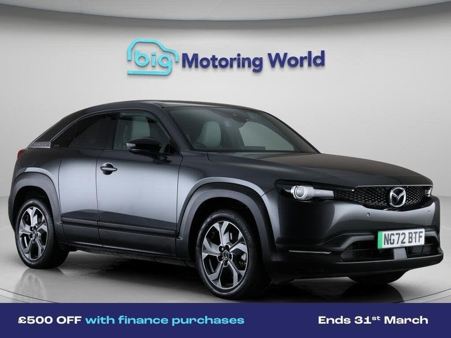 £500 towards your finance depo-Our Mazda MX-30 is finished in Grey. Specification includes a range of fantastic features including £500 towards your finance deposit, Head up Display, 18'' alloy wheels, Adaptive Cruise Control, Privacy Glass, Heated Seats, Heated Steering Wheel, Bluetooth, Blind Spot Assist, Bose Specification information is supplied by CAPHPI and may vary to the actual car. This data does not form any part of a buying contact. Please check specification prior to purchase in-store. The MOT is valid until January 2027, visit bigmotoringworld.co.uk for more photos, a 360 tour, service history and a free HPI report.Were BIG on peace of mind and this Grey Mazda MX-30 has completed our comprehensive 200 point inspection and passed all checks. Its ready for you to drive away with immediate collection in-store. We include a 90-day warranty as standard plus an option to extend for up to 3 years.Reserve this car exclusively for you, safely and securely at bigmotoringworld.co.uk, with a fully refundable £99 deposit. Test drive before you buy, with no commitment, no hassle and a completely haggle free experience. Still searching and want to see thousands more cars? We are BIG on choice with over 8000 cars to choose from.Visit our award winning web site bigmotoringworld.co.uk.Were Big Motoring World and were BIG on what matters to you.