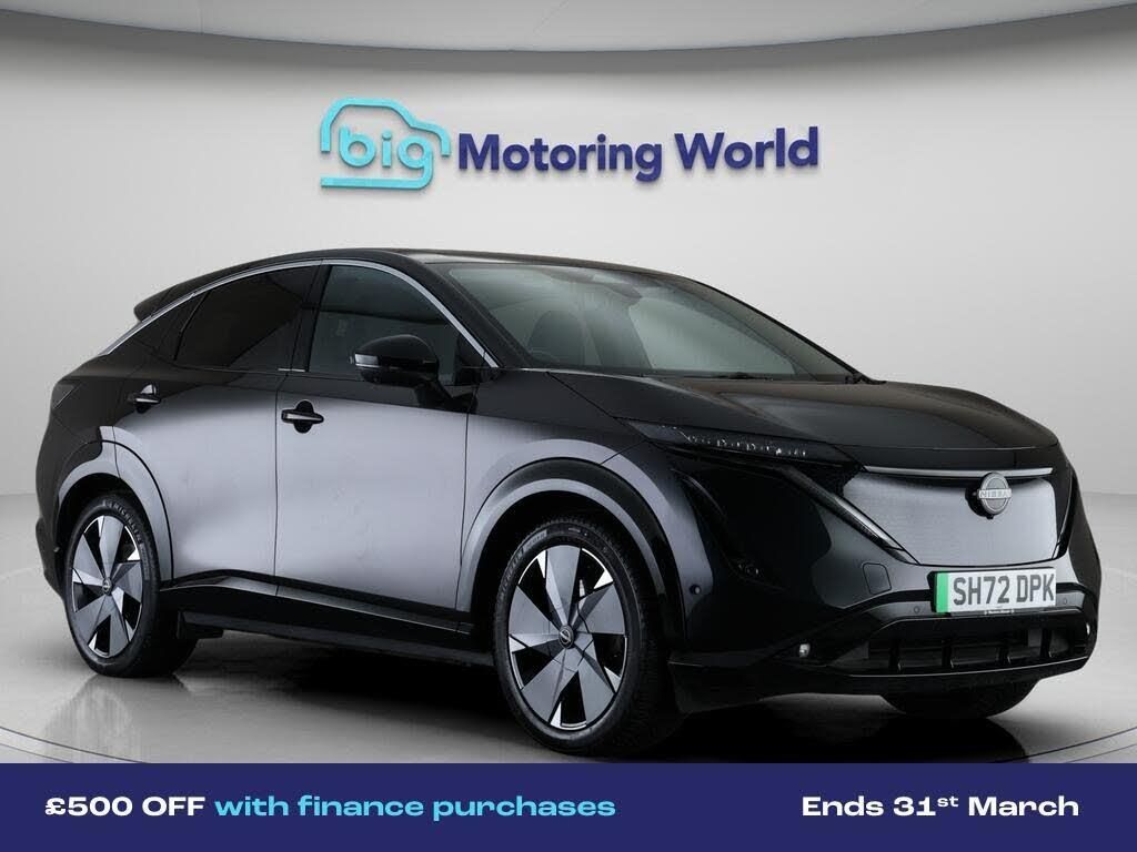 £500 towards your finance depo-Our Nissan ARIYA is finished in Green. Specification includes a range of fantastic features including £500 towards your finance deposit, Panoramic Roof, Head up Display, Apple CarPlay, Privacy Glass, Heated Seats, Comfort Ventilated Front Seats, Heated Rear Seats, Heated Steering Wheel, Bluetooth Specification information is supplied by CAPHPI and may vary to the actual car. This data does not form any part of a buying contact. Please check specification prior to purchase in-store. The MOT is valid until November 2026, visit bigmotoringworld.co.uk for more photos, a 360 tour, service history and a free HPI report.Were BIG on peace of mind and this Green Nissan ARIYA has completed our comprehensive 200 point inspection and passed all checks. Its ready for you to drive away with immediate collection in-store. We include a 90-day warranty as standard plus an option to extend for up to 3 years.Reserve this car exclusively for you, safely and securely at bigmotoringworld.co.uk, with a fully refundable £99 deposit. Test drive before you buy, with no commitment, no hassle and a completely haggle free experience. Still searching and want to see thousands more cars? We are BIG on choice with over 8000 cars to choose from.Visit our award winning web site bigmotoringworld.co.uk.Were Big Motoring World and were BIG on what matters to you.-Multi Award Winning Website & Car Supermarket of the year WINNER 2018. Call now.