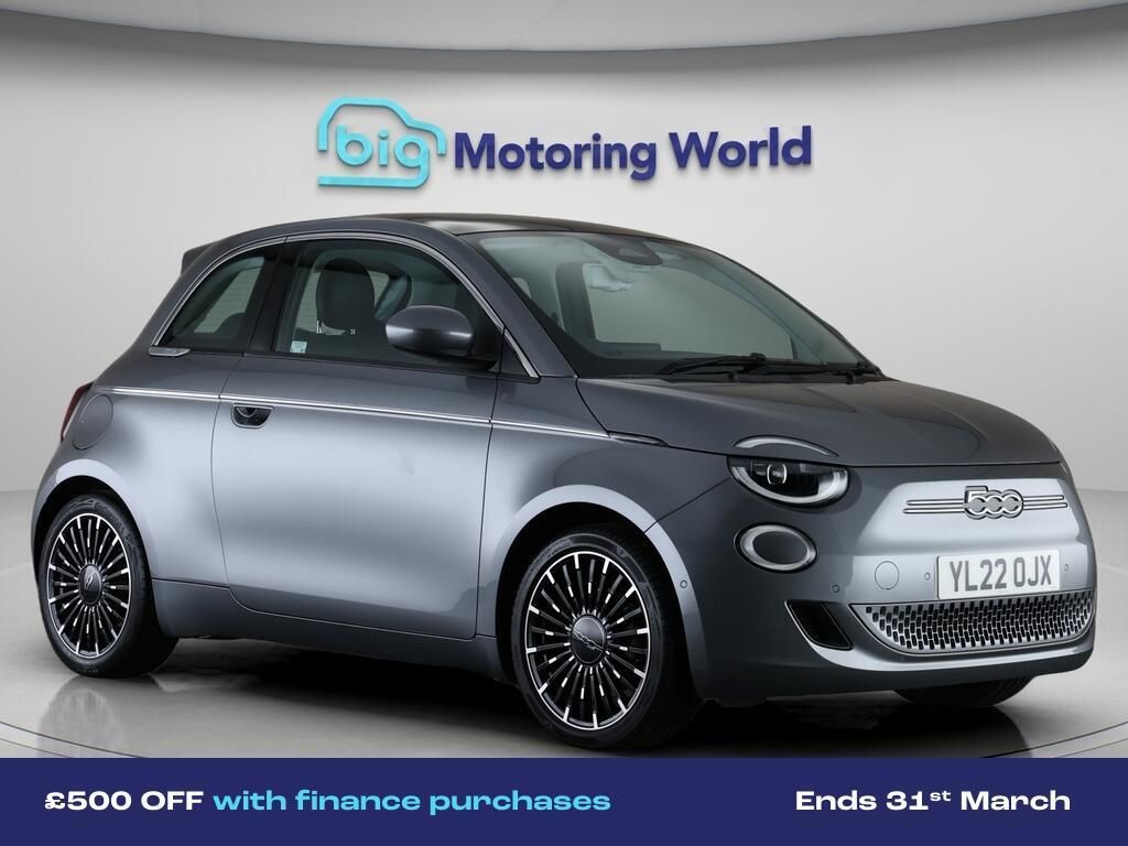 £500 towards your finance depo-Our Fiat 500e comes with optional extras worth £450. Specification includes a range of fantastic features including £500 towards your finance deposit, Panoramic Roof, 17'' Alloy Wheels, Leather Seats, Adaptive Cruise Control, Harman Kardon Speakers, Android Auto, Satellite Navigation, Heated Seats, Rear View Camera Specification information is supplied by CAPHPI and may vary to the actual car. This data does not form any part of a buying contact. Please check specification prior to purchase in-store. The MOT is valid until February 2027, visit bigmotoringworld.co.uk for more photos, a 360 tour, service history and a free HPI report.Were BIG on peace of mind and this Grey Fiat 500e has completed our comprehensive 200 point inspection and passed all checks. Its ready for you to drive away with immediate collection in-store. We include a 90-day warranty as standard plus an option to extend for up to 3 years.Reserve this car exclusively for you, safely and securely at bigmotoringworld.co.uk, with a fully refundable £99 deposit. Test drive before you buy, with no commitment, no hassle and a completely haggle free experience. Still searching and want to see thousands more cars? We are BIG on choice with over 8000 cars to choose from.Visit our award winning web site bigmotoringworld.co.uk.Were Big Motoring World and were BIG on what matters to you.-Multi Award Winning Website & Car Supermarket of the year WINNER 2018. Call now.