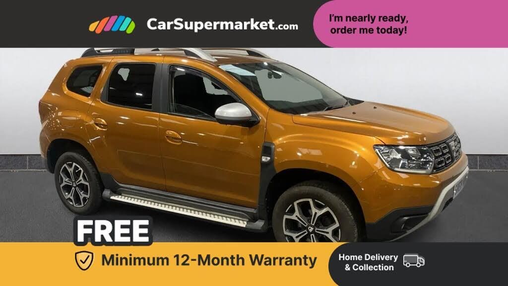Blind spot monitoring,Bluetooth connectivity,Cruise control,Eco mode,Electric power assisted steering,MediaNav Evolution 7" touchscreen multimedia system with satellite navigation with Apple car play and Android auto,Multi view camera,On board computer, odometer, trip computer, average fuel consumption, average speed, service indicator, outside temperature gauge,Rear parking camera,Rear parking sensors,Rev counter,Speed limiter,Stop/start system,4x 20W FM/AM/DAB tuner with steering column mounted fingertip controls,Aux-in socket,USB connection for MP3 players,3 speed windscreen wipers,Black side sills,Body coloured door handles,Body coloured front and rear bumpers,Chrome front grille,Dark metal door mirrors in grey,Dark tinted windows,Daytime running lights,Double optic headlights,Dusk sensor,Electric adjustable/heated door mirrors,Electric front windows,Electric rear windows,Front door sill protection strip,Front fog lights,Heated rear window,High level third rear brake light,Rear wash/wipe,Satin chrome front and rear skid plates,Satin chrome longitudinal roof bars,Tailgate trim with satin chrome Duster inscription in black background,3 rear height adjustable headrests,4 speed heating and ventilation with air recirculation,60/40 split folding rear seat,Boot light,Climate control,Driver seat lumbar adjustment,Fabric decorative insert on door panels,Front passenger reading light,Front seat armrests,Front under seat storage,Gear shift indicator,Glovebox light,Height adjustable driver seat,Height adjustable front headrests,Height adjustable steering wheel,Isofix points for child seats in both outer rear seats,Map pocket on front seat backs,Passenger sunvisor with vanity mirror,Rear passenger reading light,Satin chrome gear lever cap insert,Satin chrome interior door handles,Satin chrome lower steering wheel insert,Soft feel steering wheel,3x3 point rear seatbelts,ABS and Emergency brake assist,ASR traction control with Electronic stability control,Child locks on rear doors,Door open warning,Driver airbag,Driver and passenger seatbelt not fastened - visual and audible warning,Front passenger airbag deactivation,Front seatbelt pretensioners,Front side airbags,Height adjustable front seatbelts,Tyre pressure monitor,Keyless entry,Remote central locking,Thatcham approved engine immobiliser,Dark carbon central console surround,Matt black central console fascia,Piano black decorative insert on door panels,Satin chrome air vent surround,Satin chrome instrument dial surrounds,17" Diamond cut alloy wheels,Desert Orange,Prestige Cloth - Black