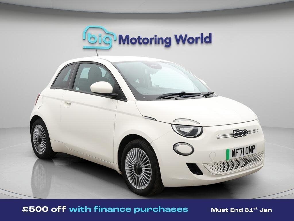 £500 towards your finance depo-Our Fiat 500e comes with optional extras worth £900. Specification includes a range of fantastic features including £500 towards your finance deposit, Apple CarPlay, Privacy Glass, Internet, Bluetooth, Parking Sensors, Cruise Control, Climate Control, Voice Control, Touch Screen Control Specification information is supplied by CAPHPI and may vary to the actual car. This data does not form any part of a buying contact. Please check specification prior to purchase in-store. The MOT is valid until September 2026, visit bigmotoringworld.co.uk for more photos, a 360 tour, service history and a free HPI report.Were BIG on peace of mind and this White Fiat 500e has completed our comprehensive 200 point inspection and passed all checks. Its ready for you to drive away with immediate collection in-store. We include a 90-day warranty as standard plus an option to extend for up to 3 years.Reserve this car exclusively for you, safely and securely at bigmotoringworld.co.uk, with a fully refundable £99 deposit. Test drive before you buy, with no commitment, no hassle and a completely haggle free experience. Still searching and want to see thousands more cars? We are BIG on choice with over 8000 cars to choose from.Visit our award winning web site bigmotoringworld.co.uk.Were Big Motoring World and were BIG on what matters to you.