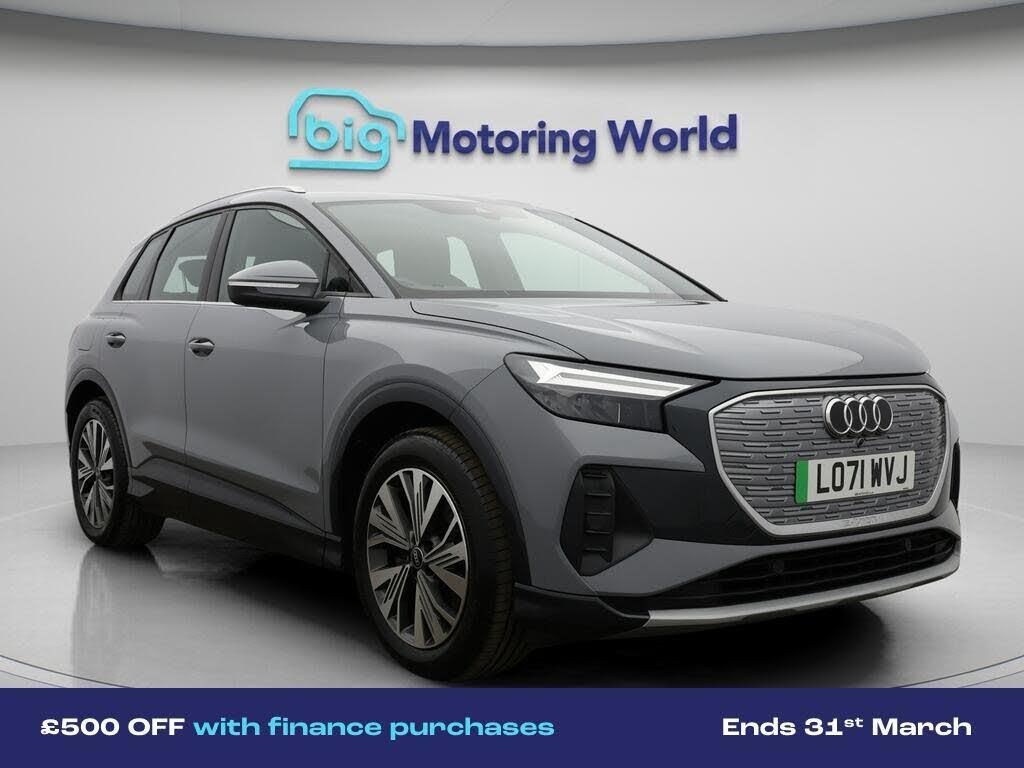 £500 towards your finance depo-Our Audi Q4 e-tron is finished in Grey. Specification includes a range of fantastic features including £500 towards your finance deposit, 19'' Alloy wheels, Apple CarPlay, Lane Assist, Android Auto, Satellite Navigation, Heated Seats, Bluetooth, Audi Connect, 2 Zone Climate Specification information is supplied by CAPHPI and may vary to the actual car. This data does not form any part of a buying contact. Please check specification prior to purchase in-store. The MOT is valid until February 2027, visit bigmotoringworld.co.uk for more photos, a 360 tour, service history and a free HPI report.Were BIG on peace of mind and this Grey Audi Q4 e-tron has completed our comprehensive 200 point inspection and passed all checks. Its ready for you to drive away with immediate collection in-store. We include a 90-day warranty as standard plus an option to extend for up to 3 years.Reserve this car exclusively for you, safely and securely at bigmotoringworld.co.uk, with a fully refundable £99 deposit. Test drive before you buy, with no commitment, no hassle and a completely haggle free experience. Still searching and want to see thousands more cars? We are BIG on choice with over 8000 cars to choose from.Visit our award winning web site bigmotoringworld.co.uk.Were Big Motoring World and were BIG on what matters to you.