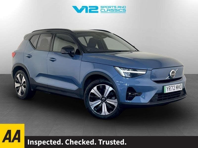 [Audio and Communications]12v Socket - Front Tunnel Console and Luggage Compartment, 9in Centre Console Portrait Touch Screen, Bluetooth Handsfree System, DAB - Digital Audio Broadcasting Radio, Google Automotive Services, High Performance Sound, Roof Antenna, Volvo Cars Services with App, Wireless-Inductive Mobile Phone Charging, [Drivers Assistance]Front Park Assist, Rear Park Assist, Rear Park Assist Camera, Road Sign Information Display, [Exterior]19in Alloy Wheels - 5 Double Spoke - Diamond Cut - Black, Autodimming Exterior Rear View Mirrors, Autofolding Heated Power Door Mirrors, Black Stone - Pillars - Roof and Door Mirrors, Colour Co-Ordinated Front Covered Grille, Dark Tinted Windows - Rear Side Windows and Rear Screen, Front and Rear Power Windows, Recharge Embossed Rear Side Roof Pillar, Roof Rails - Integrated High Gloss Black, Roof Spoiler, [Illumination]Automatic Headlight Levelling System, Automatic LED Headlights with Active High Beam incorporating Day Running Lights, Front LED Foglights, Home Safe and Approach Lighting, Puddle Lights, [Interior]Textile - Charcoal - City Canvas, 12.3in Progressive Driver Display, 2-Zone Electronic Climate Control with Rear Air Vents - CleanZone Air Quality System with Pollen Filter, 3-Spoke Tailored Sports Steering Wheel, A-Pillar Parking Ticket Holder, Advanced Interior Air Cleaner PM 2.5, Autodimming Interior Mirror, Centre Console Cupholders and Storage, Climate Pack, Fixed Rear Seat Headrests, Front Footwell Illumination, Front Load Compartment - 31 Litres, Front Reading Lights and Theatre Lighting, Front Seat Cushion Extensions, Front Tunnel Pocket and Integrated Waste Bin, Glovebox Bag Hook, Glovebox Compartment Illumination, Handsfree Tailgate Opening-Closing, Heated Front Seats, Heated Rear Seats, Heated Steering Wheel, Height and Reach Adjustable Steering Column, Height and Tilt Adjustable Driver Seat, High Gloss Black Centre Tunnel and Centre Screen Surround Deco, Illuminated Vanity Mirrors with Ticket Holder, Load Protection Net, Luggage Compartment Illumination, Multi-Directional Lumbar Support, Origin Inlay, Power Driver Seat with Memory for Seat and Exterior Mirrors, Power Passenger Seat, Rain Sensor - Automatic Windscreen Wiper Activation, Rear Armrest with Cupholders, Recharge Tread Plates - Front, Steering Wheel Remote Infotainment Controls, Underfloor Luggage Compartment Storage, Versatile Split Folding Rear Seats - 60-40, [Paint]Fjord Blue, [Performance]7m 10amp Charge Cable with 3-Pin Plug and 4.5m 3-Phase 32 amp Type 2 - Mode 3 Charge Cable, Adjustable Steering Force, Electric Front Axle Drive, Heat Pump, Speed Limiter, Speed Sensitive Steering, Touring Chassis, [Safety and Security]Adaptive Brake Lights including High Level LED Brake Light, Anti-Theft Alarm including Immobiliser - Volume Sensor and Level Sensor, Care Key with User Defined Top Speed, City Safety, Driver Assistance - Pilot Assist and Adaptive Cruise Control, Driver Awareness, Driver Knee Airbag, Dual Stage Driver and Passenger Airbags, High Gloss Black Window Trim - Front and Rear Skidplate and Deco Lower Front Bumper, Hill Descent Control, Hill Start Assist, IC - Inflatable Curtains - Full Length, ISOFIX Attachment - Front Passenger and Outer Rear Seats, Key Integrated Remote Control Central Locking including Fuel Flap with Deadlocking System and Auto Open-Close Power Windows, Keyless Drive - Keyless Entry and Keyless Start, Lane Keeping Aid with Driver Alert Control, Low Speed Exterior Sound Speaker, Oncoming Lane Mitigation, Passenger Airbag Cut-Off Switch, Power Child Locks - Rear Doors, Private Locking for Tailgate, Run-Off Road Protection, SIPS - Side Impact Protection System, SIPS Airbags - Front Seats, Seatbelt Reminder and Pretensioners, Slippery Road and Hazard Light Alert, Stability and Traction Control, Vehicle Deceleration Control, Visible VIN Plate, WHIPS - Whiplash Protection System - Front Seats