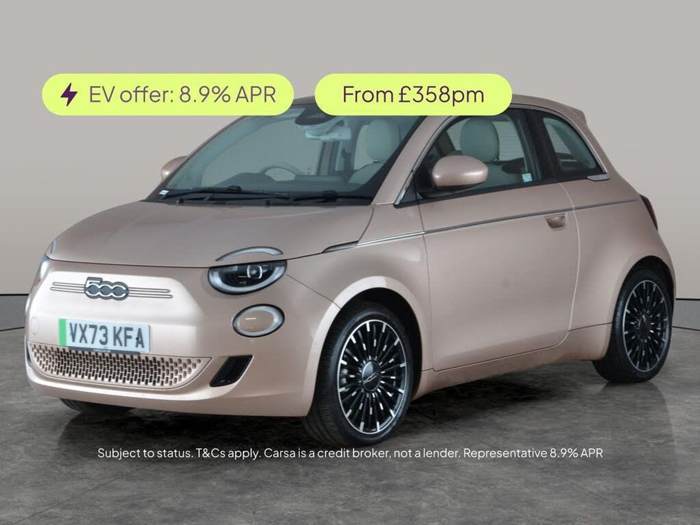 Experience the chic Fiat 500e in stunning gold, with a luxurious beige eco-leather interior and stylish grey braided dashboard. Enjoy open-air drives with the panoramic sunroof, hear every note with the upgraded JBL sound system, and travel in comfort with heated seats and 17in alloy wheels. Navigation and Apple CarPlay keep you connected, while LED headlights and blind spot assist offer top-notch safety. The Fiat 500e blends innovation and iconic style for a premium electric drive. 1 service recorded, last serviced on 30/01/2026 at 8,678 miles. MOT to 29/12/2026. Visit our website for service history, online valuation, full vehicle specification plus multiple images. This vehicle is VAT qualifying. Any feature/option specified here is from 3rd party data. We cannot guarantee the accuracy of any specification supplied by a 3rd party. We recommend that you physically check the specification of the vehicle on site prior to purchase. This information does not form part of the buying contract. Terms & Conditions apply. We have over 2,000 cars available from our 10 national branches, check our website to see all our stock. Our Trustpilot rating is 4.4/5 with over 9,000 reviews.