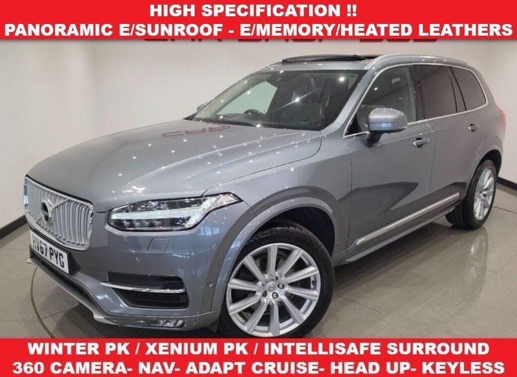 Park Assist Pilot, Dynamic Pack, Rear Park Assist Camera, Subwoofer, Power Folding 2nd Row Headrests, Winter Pack, Power Adjustable Front Seat Side Support, Laminated Windows - Side, 20in Alloy Wheels - 5-Double-Spoke Diamond Cut-Matt Tech - Black, 12.3in Active TFT Crystal Drivers Information Display, 12v Socket, 2-Zone Electronic Climate Control with CleanZone Air Quality System with Pollen Filter, 20in Alloy Wheels - 10-Spoke Diamond Cut Light Grey, 2nd Row Centre Armrest with Storage and Cupholders, 3 Spoke Leather Steering Wheel and Illuminated Gear Knob with Chrome Trim, 9in Centre Console Touch Screen, A-Pillar Parking Ticket Holder, Adaptive Brake Lights including High Level LED Brake Light, Adaptive Cruise Control, Adjustable Steering Force, Ambient Door and Instrument Panel Lighting, Anti-Theft Alarm including Immobiliser - Volume Sensor and Level Sensor, Auto Dimming Interior and Exterior Mirrors, Automatic Headlight Levelling System, B-Pillar Ventilation, Bluetooth Handsfree System, Bright Metal Luggage Compartment Threshold, Cargo Divider with Grocery Bag Holder, Centre Console Cupholders and Storage, Chrome Door Handle Deco Strip and Window Surround, Chrome Lower Side Mouldings with Inscription Logo, City Safety, Colour Co-Ordinated Autofolding Heated Power Door Mirrors, DAB - Digital Audio Broadcasting Radio, Distance Alert, Drive Mode Settings, Driver Knee Airbag, Drivers Side Lower Dashboard Storage Compartment, Dual Integrated Exhaust Pipes, Dual Stage Driver and Passenger Airbags, First Aid Kit, Front Footwell and Side Step Illumination, Front LED Fog Lights with Cornering Function, Front and Rear Power Windows, Front and Rear Reading Lights - Theatre Lighting and Centre Armrest Storage Illumination, Handsfree Tailgate Opening-Closing, Headlight Cleaning System, Heated Front Seats, Height and Reach Adjustable Steering Column, Hill Descent Control, Hill Start Assist, Home Safe and Approach Lighting, IC - Inflatable Curtains, ISOFIX Attachment, Illuminated Vanity Mirrors with Ticket Holder, Illumination Pack, Integrated Sun Curtains - Rear Doors, Key Integrated Remote Control Central Locking including Fuel Flap with Deadlocking System and Auto Open-Close Power Windows, Keyless Drive with Remote Tag, Keyless Start, LED Active Bending Headlights with Adaptive Shadow Technology, LED Headlights with Active High Beam Incorporating Day Running Lights, Lane Keeping Aid with Driver Alert Control, Leather Instrument Panel and Door Tops, Linear Walnut Inlays, Lockable Glovebox Compartment with Illumination, Locking Wheel Nuts, Luggage Compartment Illumination, Luxury Floor Mats, Matt Silver Front Grille, Mechanical Child Locks - Rear Doors, Nappa Leather Coloured Key Integrated Remote, Outboard Armrest with Cupholder and Storage for Third Row Passengers, Passenger Airbag Cut-Off Switch, Passenger Seat with Power Height Adjustment and Multi-Directional Lumbar Support, Pilot Assist - Up to 80mph, Power Driver Seat with Multi-Directional Lumbar Support and Memory for Seat and Exterior Mirrors, Power Operated Tailgate, Power Parking Brake with Auto Hold Function, Power Passenger Seat with Memory, Private Locking for Glovebox and Tailgate, Puddle Lights, Rain Sensor - Automatic Windscreen Wiper Activation, Rear Park Assist, Road Edge Detection, Road Sign Information Display, Roof Antenna, Roof Rails - Raised Silver, Roof Spoiler, Run-Off Road Protection, SIPS - Side Impact Protection System, SIPS Airbags - Front Seats, Seatbelt Reminder and Pretensioners, Semi-Automatic Load Cover, Sensus Connect with High Performance Sound, Sensus Navigation, Speed Limiter, Speed Sensitive Steering, Stability and Traction Control, Steering Wheel Remote Infotainment Controls, Tailgate Illumination, Tempa Spare Wheel and Jack, Three 2nd Row Individual Folding Passenger Seats with Fore-Aft Adjustment, Touring Chassis, Transmission - Sport Mode and Manual Change Functions, Two 3rd Row Individual Folding Passenger Seats, Tyre Pressure Monitoring System, Underfloor Cargo Storage, Vehicle Deceleration Control, Visible VIN Plate, Voice Activated Control for Key Functions, Volvo On Call with App, WHIPS - Whiplash Protection System - Front Seats, Warning Triangle, Blind Spot Information System - BLIS with Cross Traffic Alert - CTA and Rear Collision Mitigation, Dark Tinted Windows - Rear Doors and Cargo Area, Head-Up Display in Windscreen, Heated Steering Wheel, Nappa Soft Leather - Charcoal, Osmium Grey, Parking Camera 360 Surround View, Power Glass Tilt and Slide Panoramic Sunroof with Sun Curtain, Winter Pack in Combination with Head-Up Display in Windscreen, Xenium Pack