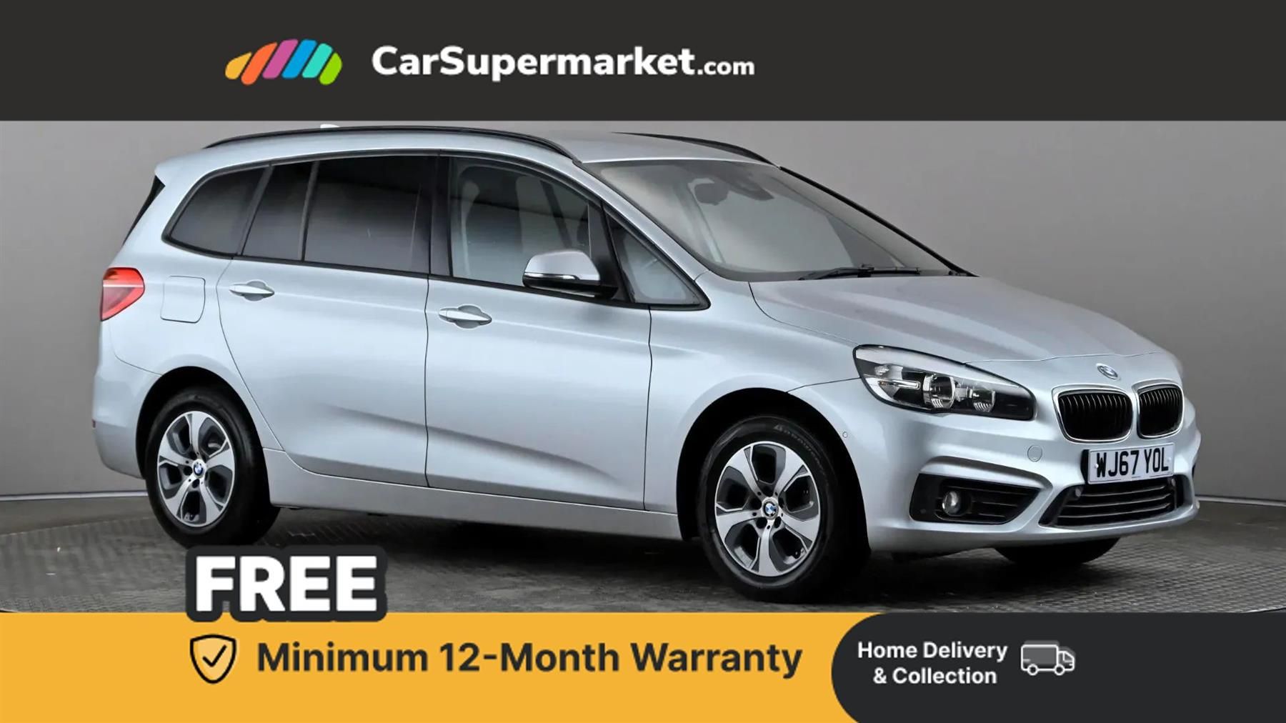 Attentiveness assist,Automatic tailgate operation,BMW Online services,BMW Teleservices,Check control system,Door/boot open warning light,Forward collision warning,Lights on warning,Oil temperature gauge,On board computer,Outside temperature display,Personal Profile,Service interval indicator,Speed limiter,Stop/start button,Diesel particulate filter,Drive Performance Control,Electronic differential lock,Sports function on gearbox with steering wheel mounted gearshift paddles,Bluetooth audio streaming,BMW professional radio/CD/MP3,DAB Digital radio,Body colour bumpers,Body colour door handles,Body colour door mirrors,Body colour roof mouldings,Chrome exhaust tailpipe,Chrome kidney grille with black vertical slats,Door mirror integrated indicators,Door sill finishers,Electric adjustable heated door mirrors,Electric front/rear windows with one touch/auto up/down,Follow me home headlights,Front fog lights,Green tinted heat insulating glass,Heated windscreen washer jets,High beam assistant,LED daytime running lights,Rain sensor including auto headlights activation,Rear wiper,Welcome lighting,12V sockets in front centre console and passenger footwell,2 individual fold flat 3rd row seats,3 rear headrests,3 spoke sports leather multi-function steering wheel,4 grab handles,40:20:40 split folding rear bench seat,Dual zone automatic air conditioning,Front armrest,Front head restraints,Front/rear armrests within door panels,Illuminated glovebox,Isofix front passenger and rear seat preparation,Luggage compartment lighting,Reach + rake adjustable steering column,Rear centre armrest,Sliding rear seats,Sunvisors,Underfloor stowage compartment,Extended lights package - 2 Series Gran Tourer,Extended storage pack - 2 Series Active/Gran Tourer,3 point seatbelts on all seats,ABS,BMW emergency call,Brake assist function,Childproof rear door locks,Collision mitigation braking system,Crash Sensor - activates hazard/interior lighting + unlocks doors,Driver/Front Passenger airbags,DSC+,Dynamic Traction Control - DTC,Front and rear curtain airbags,Front passenger airbag deactivation,Front seatbelt force limiters,Front seatbelt pretensioner,Front side airbags,Hill start assist,Seatbelt warning,Side impact protection,Tyre pressure monitoring system,Warning triangle and first aid kit,Electronic immobiliser,Key integrated remote control central locking,Locking wheel bolts,Remote control Thatcham category 1 alarm,Low rolling resistance tyres,16in Alloy Wheels - Turbine - 472,Door Mirrors - Electric Folding,Glacier Silver,Grid Cloth - Anthracite,Lumbar Support - Driver and Front Passenger,PDC - Park Distance Control - Front and Rear,Rear Folding Tray Tables,Sun Protection Glazing