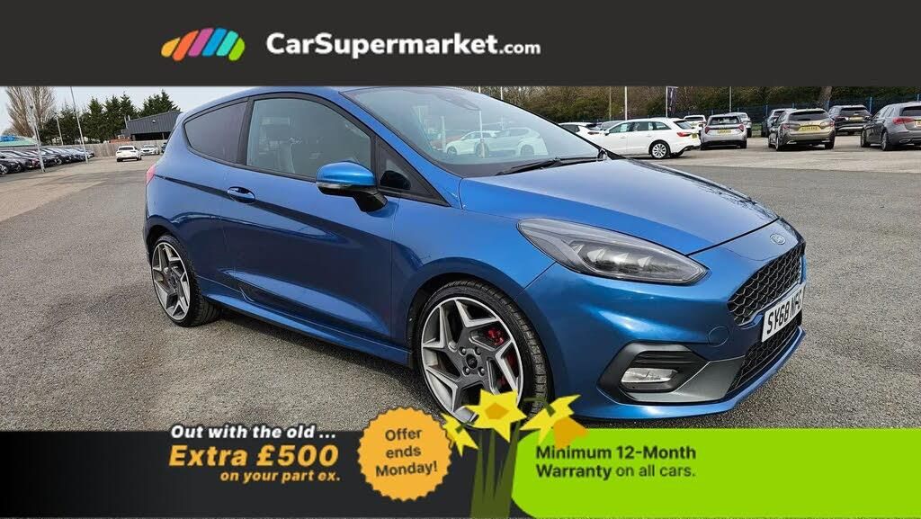 Bluetooth system,Cruise control,Drive mode selector,Electric power steering,Ford easy fuel,Trip computer,Sports suspension,2 USB ports,Auxiliary input socket,Steering wheel mounted controls,Auto dimming rear view mirror,Body colour bumpers,Body colour door handles,Body colour electric adjustable heated door mirrors with integral indicators,Body colour large rear spoiler,Chrome lower window surround,Cornering front fog lights,Electric front windows/one touch facility,LED Night signature to rear lights,LED rear lights,Power foldable door mirrors with puddle lights,Quickclear heated windscreen,Rain sensing wipers and auto dimming rear view mirror,Rear privacy glass,Rear wiper,Rugged body styling kit with active front wing badges,Tinted glass,Unique ST-Line upper grille & full bodystyling kit with ST-Line wing badges,12V Accessory socket in centre console,3 spoke flat bottomed leather steering wheel with red stitching,60/40 split folding rear seat,Adjustable head restraints,Ambient lighting,Black headlining,Boot carpet,Centre console with armrest and illuminated cupholders,Chrome inner door handles,EATC - Electronic Auto Temperature control,Footwell illumination,Front map reading lights,Front seat and rear pockets,Illuminated glovebox,Leather gear knob,Leather trimmed handbrake handle,Load area light,Overhead console with sunglasses holder,Pollen filter,Rake/reach adjustable steering wheel,Rear centre head restraint,Recaro part leather front sports seats,Sports pedals,Driver assistance pack - ST2/ST3/ST Performance Edition,NCAP Pack - Fiesta,Rear view camera pack - Fiesta,3 point seatbelts on all rear seats,ABS+EBA,Curtain airbags,Driver and passenger airbags,Drivers knee airbag,Electronic stability control with hill start assist,Front passenger airbag deactivation,Front side airbags,Seatbelt warning,Tyre pressure monitoring system,MyKey system,Remote central locking & engine immobiliser,Thatcham Cat.1 alarm,USB connection,Automatic headlights,Driver's lumbar support,Heated front seats,Heated steering wheel,Passenger seat lumbar adjust,Recaro sports front seats,Red brake calipers,Keyless entry and keyless start,18" 5 spoke alloy wheels with Magnetic machined finish