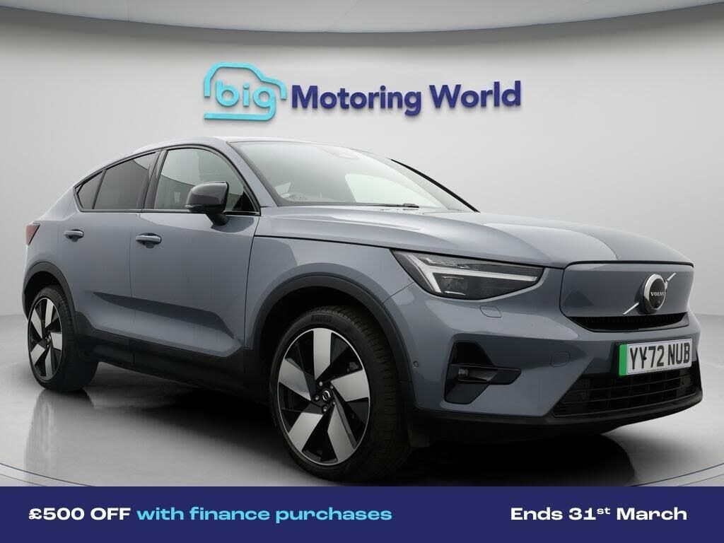£500 towards your finance depo-Our Volvo C40 is finished in Grey. Specification includes a range of fantastic features including £500 towards your finance deposit, Panoramic Roof, 20'' Alloy Wheels, Adaptive Cruise Control, Harman Kardon Speakers, Premium Sound System, Privacy Glass, Heated Seats, Gesture Tailgate, Rear View Camera Specification information is supplied by CAPHPI and may vary to the actual car. This data does not form any part of a buying contact. Please check specification prior to purchase in-store. The MOT is valid until December 2026, visit bigmotoringworld.co.uk for more photos, a 360 tour, service history and a free HPI report.Were BIG on peace of mind and this Grey Volvo C40 has completed our comprehensive 200 point inspection and passed all checks. Its ready for you to drive away with immediate collection in-store. We include a 90-day warranty as standard plus an option to extend for up to 3 years.Reserve this car exclusively for you, safely and securely at bigmotoringworld.co.uk, with a fully refundable £99 deposit. Test drive before you buy, with no commitment, no hassle and a completely haggle free experience. Still searching and want to see thousands more cars? We are BIG on choice with over 8000 cars to choose from.Visit our award winning web site bigmotoringworld.co.uk.Were Big Motoring World and were BIG on what matters to you.