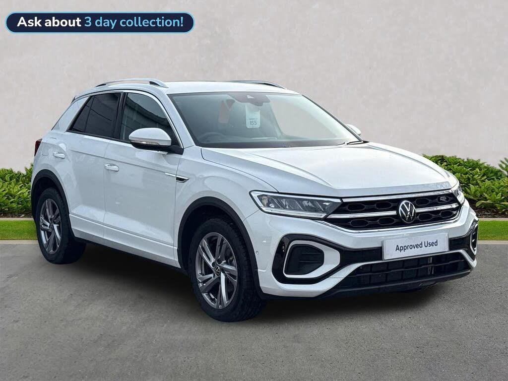 Volkswagen T-Roc 1.5 TSI R-Line DSG Petrol | Automatic | 150 PS | SUV 9,275 miles | Pure White Vehicle Overview Presented in Pure White with a SoulFlint Grey and Titanium Black interior, this Volkswagen T-Roc R-Line combines sporty styling with smooth DSG automatic performance. The 1.5 TSI 150 PS petrol engine delivers an excellent balance of power and efficiency, while the R-Line specification enhances both driving dynamics and visual appeal. With just 9,275 miles, this is a high-specification, low-mileage example ready for immediate enjoyment. Key Vehicle Details Mileage: 9,275 miles Transmission: DSG Automatic Fuel Type: Petrol Power: 150 PS Exterior Styling R-Line styling package Sports suspension Progressive steering High Beam Assist Rear view camera Solid Paint Pure White Interior & Technology SoulFlint Grey / Titanium Black interior Discover Media Navigation with Streaming & Internet Wireless App-Connect (Apple CarPlay & Android Auto) eSIM for online connectivity 6-speaker sound system (front and rear) Heated front seats (Winter Pack) Driving Profile Selection with ECO function Dynamic road sign display Driver Assistance & Safety Front Assist with Autonomous Emergency Braking Adaptive Cruise Control with speed limiter (up to 130 mph) Extended Safety System with proactive passenger protection Multifunction front-facing camera Rear view camera Anti-theft alarm with interior monitoring and towing protection Central locking with SAFELOCK and 2 remote folding keys Tool kit with jack Volkswagen Approved Used Benefits (2026) Finance your Volkswagen with Solutions PCP and enjoy: Up to 2 years Servicing¹ for only £99 1 year Volkswagen Warranty² 1 year Roadside Assistance² Comprehensive multi-point vehicle checks Independent history and mileage verification 30-day / 1,000-mile no quibble exchange Deposit Contributions with Solutions PCP £250 deposit contribution on vehicles aged 012 months³ £250 deposit contribution on vehicles aged 1336 months³ Important Information ¹ Available on all vehicles up to 8 years old. Covers two consecutive services for Petrol, Diesel and eHybrid vehicles. Servicing for Battery Electric Vehicles also includes 1 x MOT. Volkswagen Finance. ² Valid for vehicles up to 100,000 miles and less than 8 years old at point of activation. Offer subject to change or removal at any time. Accurate at 01/26. ³ Ordered by 31/03/2026. Indemnities may be required. Offer subject to change or removal at any time. Excludes Volkswagen Commercial Vehicles. Volkswagen Finance.