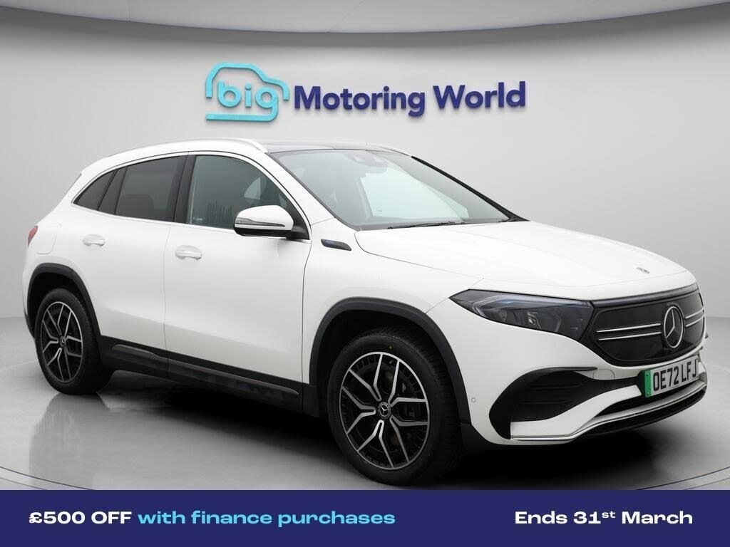 £500 towards your finance depo-Our Mercedes-Benz EQA is finished in White. Specification includes a range of fantastic features including £500 towards your finance deposit, Comfort Pack, 19'' Alloy wheels, Part Leather Seats, Air Suspension, Apple CarPlay, Burmester Speakers, AMG body styling, Parking Pack, Premium Specification information is supplied by CAPHPI and may vary to the actual car. This data does not form any part of a buying contact. Please check specification prior to purchase in-store. The MOT is valid until December 2026, visit bigmotoringworld.co.uk for more photos, a 360 tour, service history and a free HPI report.Were BIG on peace of mind and this White Mercedes-Benz EQA has completed our comprehensive 200 point inspection and passed all checks. Its ready for you to drive away with immediate collection in-store. We include a 90-day warranty as standard plus an option to extend for up to 3 years.Reserve this car exclusively for you, safely and securely at bigmotoringworld.co.uk, with a fully refundable £99 deposit. Test drive before you buy, with no commitment, no hassle and a completely haggle free experience. Still searching and want to see thousands more cars? We are BIG on choice with over 8000 cars to choose from.Visit our award winning web site bigmotoringworld.co.uk.Were Big Motoring World and were BIG on what matters to you.