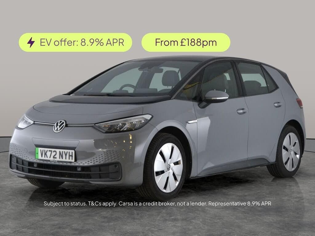 Experience the future with this sleek grey Volkswagen ID.3. Enjoy seamless journeys thanks to Adaptive Cruise Control, crisp tunes via Apple CarPlay and Bluetooth Audio Streaming, and smart tech including Sat Nav, Traffic Sign Recognition, and Lane Departure Warning. Drive confidently day or night with LED headlights, parking sensors front and rear, and selectable driving modes. The added Comfort and Assistance Packs ensure every journey is smooth and connected. Your everyday electric adventure awaits. 1 service recorded, last serviced on 06/11/2024 at 7,232 miles. MOT to 25/02/2027. Visit our website for service history, online valuation, full vehicle specification plus multiple images. This vehicle is VAT qualifying. Any feature/option specified here is from 3rd party data. We cannot guarantee the accuracy of any specification supplied by a 3rd party. We recommend that you physically check the specification of the vehicle on site prior to purchase. This information does not form part of the buying contract. Terms & Conditions apply. We have over 2,000 cars available from our 10 national branches, check our website to see all our stock. Our Trustpilot rating is 4.4/5 with over 9,000 reviews.