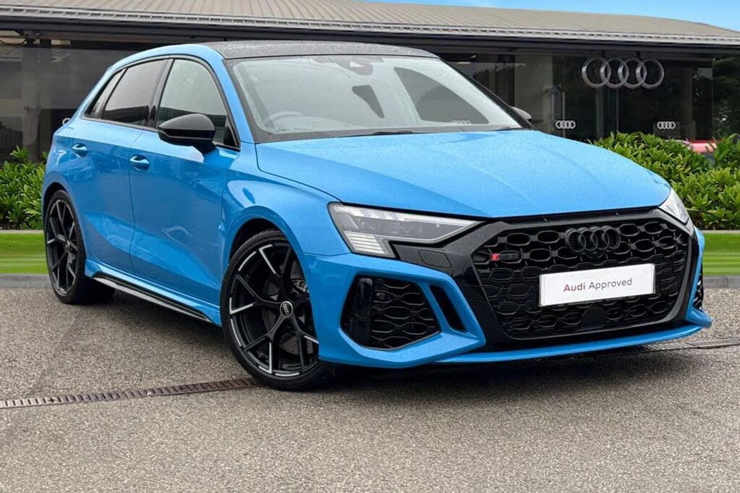 Experience the thrill of driving with this Audi RS 3 Sportback Vorsprung in striking Turbo Blue. At its heart lies a 400 PS engine paired with the lightning-fast S tronic gearbox, delivering breathtaking acceleration and a top speed of 174 mph. The RS sports exhaust system in black perfectly complements the performance, offering that unmistakable Audi RS roar. Sitting proudly on 19-inch 5-Y-spoke black alloy wheels with RS adaptive suspension and Audi drive select, this Sportback ensures a refined, responsive ride, whether on city streets or open roads. Matrix LED headlights with dynamic indicators, darkened front design, and digital matrix technology illuminate your path while adding aggressive styling cues. Step inside to a cabin designed for comfort and precision. Electrically adjustable front seats with memory and 4-way lumbar support, full decorative carbon trim, panoramic glass sunroof, and ambient lighting create a luxurious, driver-focused environment. The 3-spoke leather multifunction steering wheel with gear-shift paddles puts complete control at your fingertips. Technology meets convenience with MMI navigation plus, Audi Virtual Cockpit with RS-specific display, head-up display, Bang & Olufsen 3D sound, Audi phone box with wireless charging, and a comprehensive Driver Assistance Pack including adaptive cruise control, traffic sign recognition, and parking system plus. Comfort key, power tailgate, and advanced safety features like Audi Pre-Sense Front and collision avoidance round off a package designed for effortless driving and maximum enjoyment. For more information on this Audi RS3 please give us a call and a member of our friendly sales team will be more than happy to help you further to book a test drive or introduce you to a range of flexible finance packages to suit you. This vehicle is fully compliant with either the Clean Air Zone (CAZ) or Ultra Low Emission Zone (ULEZ) standards