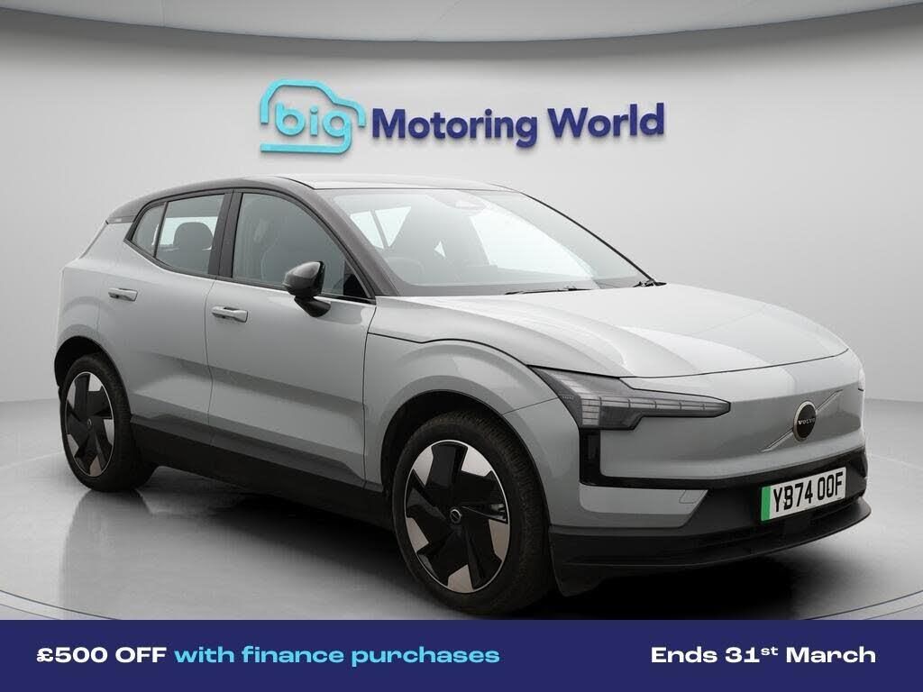£500 towards your finance depo-Our Volvo EX30 is finished in Grey. Specification includes a range of fantastic features including £500 towards your finance deposit, Apple CarPlay, Adaptive Cruise Control, Harman Kardon Speakers, Bluetooth, Blind Spot Assist, 2 Zone Climate, Cruise Control, Climate Control, DAB Radio Specification information is supplied by CAPHPI and may vary to the actual car. This data does not form any part of a buying contact. Please check specification prior to purchase in-store. The MOT is valid until January 2028, visit bigmotoringworld.co.uk for more photos, a 360 tour, service history and a free HPI report.Were BIG on peace of mind and this Grey Volvo EX30 has completed our comprehensive 200 point inspection and passed all checks. Its ready for you to drive away with immediate collection in-store. We include a 90-day warranty as standard plus an option to extend for up to 3 years.Reserve this car exclusively for you, safely and securely at bigmotoringworld.co.uk, with a fully refundable £99 deposit. Test drive before you buy, with no commitment, no hassle and a completely haggle free experience. Still searching and want to see thousands more cars? We are BIG on choice with over 8000 cars to choose from.Visit our award winning web site bigmotoringworld.co.uk.Were Big Motoring World and were BIG on what matters to you.