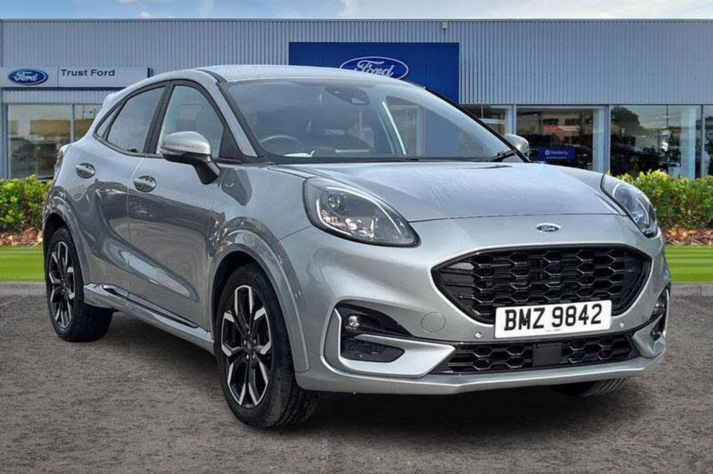 Driver impairment monitor, Emergency call service, Ford easy fuel, Full digital 12.3 instrument cluster, Lane keeping aid with lane departure warning, Power assist steering, Power start button, Rear parking sensor, Selectable drive modes(Normal, Eco, Sport, Slippery and Trail), Speed sign recognition, Automatic headlights with auto high beam, Automatic rain sensing wipers, Front fog lamps, LED daytime running lights, LED rear lamps, Power foldable heated door mirrors with puddle lamps, Privacy glass to side rear windows and tailgate glass, Quickclear heated windscreen, Rear side wing doors, Rear wiper, ST-Line body styling kit with unique grille, Third brake light, 3 seat bench in 2nd row, Centre console with armrest and stowage, Ford megabox extended bootspace, Front and rear head restraints, Front floor mats, Manual 4 way driver seat adjust with lumbar adjustment, Manual 4 way passenger seat with lumbar seat adjustment, Sensico partial premium upholstery, Single front passenger seat, ST-Line flat bottomed sensico leather steering wheel with leather handbrake and aluminium gear knob, Wireless charging pad with electronic air temperature control (EATC), 3 rear seatbelts, Child safety lock, Electronic stability control (ESC) and hill start assist, Pedestrian/cyclist detection & post-collision braking, Pre collision assist system, Tyre pressure monitoring system (TPMS)