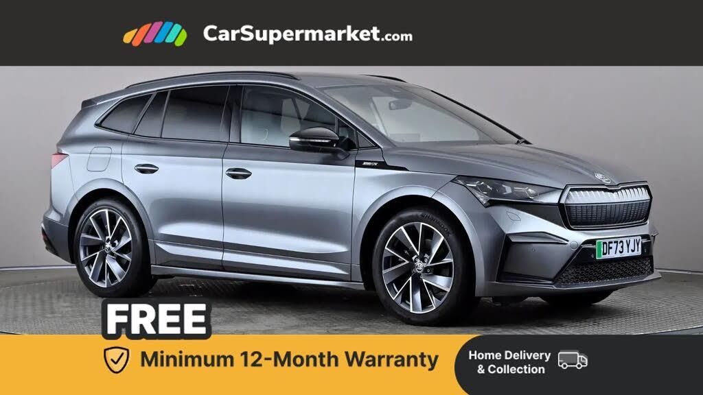 13" touchscreen display,Bluetooth system,E-call,Electrically operated tailgate with kick activation (virtual pedal),Electronic engine sound,Exterior temperature indicator,Front and rear parking sensors,Gesture control,Progressive steering,Rear view camera,Satellite navigation system,Skoda Connect iV remote services with charging, air conditioning and smart schedules,Speed limiter,Tailgate unlocking from outside,Travel assist with emergency assist, lane assist plus with narrow lane assist and urban evasive steering support,Virtual cockpit,Voice control system,Washer fluid level indicator,Wi-Fi hotspot,Wireless smartlink,135 kW DC charging,6m mode 3 cable (32A),Shock absorption in front,Shock absorption in rear,Sports suspension,8 Speakers,DAB Digital radio,USB-C ports (charging + data),Additional body cover on wheel arch and side sill,Auto dimming door mirrors,Auto dimming rear view mirror,Black decorative trims (including window and grille surround),Black roof rails,Body colour bumpers,Body colour door mirrors and handles,Dashboard and door moulding light in multiple colours,Door mirror memory,Dynamic headlight range control with cornering light function,Electric adjustable heated folding door mirrors with boarding spots and welcome logo,Electric front and rear windows,Front fog lights,Full LED Matrix beam headlights with variable light distribution,Full LED rear lights with variable lighting functions,Headlight washers,Heat insulating darkened glass in side and rear windows,Heat insulating glass in windshield,Heated rear window,LED daytime running lights,LED third brake light,Light assistant (coming home/tunnel light),Radiator grille frame in gloss black,Rain and light sensors,Rear side wing doors,Rear spoiler,Rear window wiper with washer system and intermittent control,Safety reflectors on front and rear doors,Skoda lettering on tailgate in black,Sports bumpers,Tow bar preparation,Variable front intermittent wipers,12V socket in boot,3 rear headrests,3 seat bench in 2nd row,4 foldable roof handles with rear coat hooks,60:40 foldable rear seat with sliding adjustment and backrest angle adjustment,Aluminium pedals,Boot lighting,Coat hooks on B pillar,Driver's electric adjustable lumbar support,Electrically adjustable driver seat with memory function,Front and rear footwell lighting,Front and rear height adjustable headrests,Front courtesy lights,Front headrests,Front reading lights,Front sport seats,Height adjustable front passenger seat,High centre console,Illuminated and cooled glovebox,Interior door handle lighting in front and rear,Isofix child seat fittings in outer rear seats with top tether,Isofix child seat preparation for front passenger seat,Laminated soft-touch plastic knee rest,LED ambient lighting,Manual lumbar support for front passenger seat,Manually adjustable steering column,Pollen filter,Rear reading lights,Rear storage compartment,Single front passenger seat,Sliding boot cover,Sunvisors with illuminated vanity mirrors,Umbrella in door panel,Clever pack - Enyaq Sportline,SportLine design pack with Microsuede/leather - Enyaq,3 point height adj front seatbelts + pretensioners,Auto door release and activation of warning lights in the event of an accident,Central interaction airbag,Driver and front passenger airbags,ESC (incl. ABS+MSR+ASR+EDS+HBA+DSR+RBS+MKB),Front and rear three point safety belt on all seats,Front assist with assisted automatic braking,Front disc brakes,Front passenger airbag deactivation switch,Front side airbags with curtain airbags,Rear drum brakes,Single tone horn,Tyre pressure monitor,Visual and acoustic seat belt reminder,Warning lights in front doors,Anti theft alarm system with interior monitoring, backup horn and towing protection,Remote central locking with SAFE system,Anti-theft wheel bolts protection,Tyre repair kit with compressor
