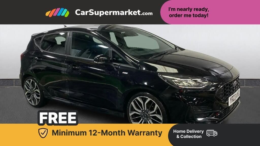 Parking Sensors, Quickclear Heated Windscreen, Privacy Glass, Heated Front Seats, Keyless Entry, Satellite Navigation, Bluetooth;The Ford Fiesta 1.0 EcoBoost ST-Line X in black is a sporty and refined hatchback featuring parking sensors, Quickclear heated windscreen, privacy glass, heated front seats, keyless entry, and the SYNC 3 system with navigation. Optional extras cost £1,125.00, adding luxury touches to this high-spec ST-Line model.