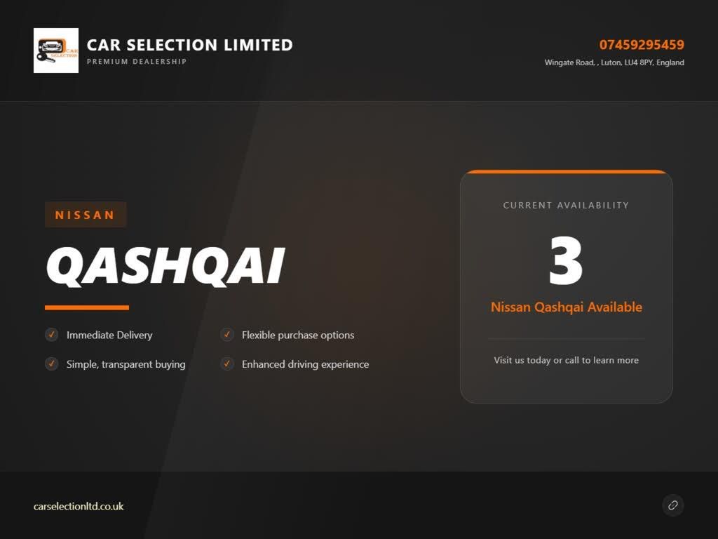 19in Alloy Wheels - 5-Spoke, 3 x 3-Point Rear Seatbelts with ELR, 5in High Definition Full Colour TFT Screen Combimeter, 6 Speakers, 60-40 Split Rear Folding Seats, AUX Socket for MP3 Player, Alarm, Automatic Folding Door Mirrors, Automatic Lights and Wipers, Black Honeycomb Front Grille, Bluetooth, Body-coloured Bumpers - Handles and Mirrors, CD Radio, Chrome Glass Surround, Cruise Control with Speed Limiter, Drive Computer, Driver Seat Height Adjustment, Driver-Passenger-Side and Curtain Airbags, Drivers Side One-touch and Anti-trap Window, Dual Zone Climate Control Air Conditioning, ESP ABS EBD and Brake Assist, Electric Speed-Sensitive Power Steering, Executive Pack, Front Centre Console and Armrest, Front Fog Lamps with Chrome Ring, Front Seat Belt Height Adjustment, Front Seat Belts with Load Limiter and Pretensioners, Front and Rear Electric Windows, Head Restraints - 3 Rear, Headlights - Automatic Levelling, Headlights - Bi-LED, Heat Pack, Height Adjustable Front Head Restraints, Hill Start Assist, ISOFIX Child Seat Anchoring Points, Immobiliser, Intelligent Key, Intelligent Park Assist, Interior Ambient Lighting, LED Signature Daytime Running Lights, Leather Steering Wheel, Luggage Board System, Nissan Chassis Controls, Puncture Repair Kit, Push Start-Stop Button, Rear Door Child Locks, Rear Privacy Glass, Rear Seat Armrest with 2 Cupholders, Remote Audio Control, Roof Rails - Satin Silver, Safety Shield, Seats - Drivers Lumbar Support, Seats - Passengers Height Adjustment, Selectable Steering - Normal or Sport, Smart Vision Pack, TPMS - Tyre Pressure Monitoring System, Tech Pack, Tilt and Telescopic Adjustable Steering Wheel, e-PKB - Electric Parking Brake
