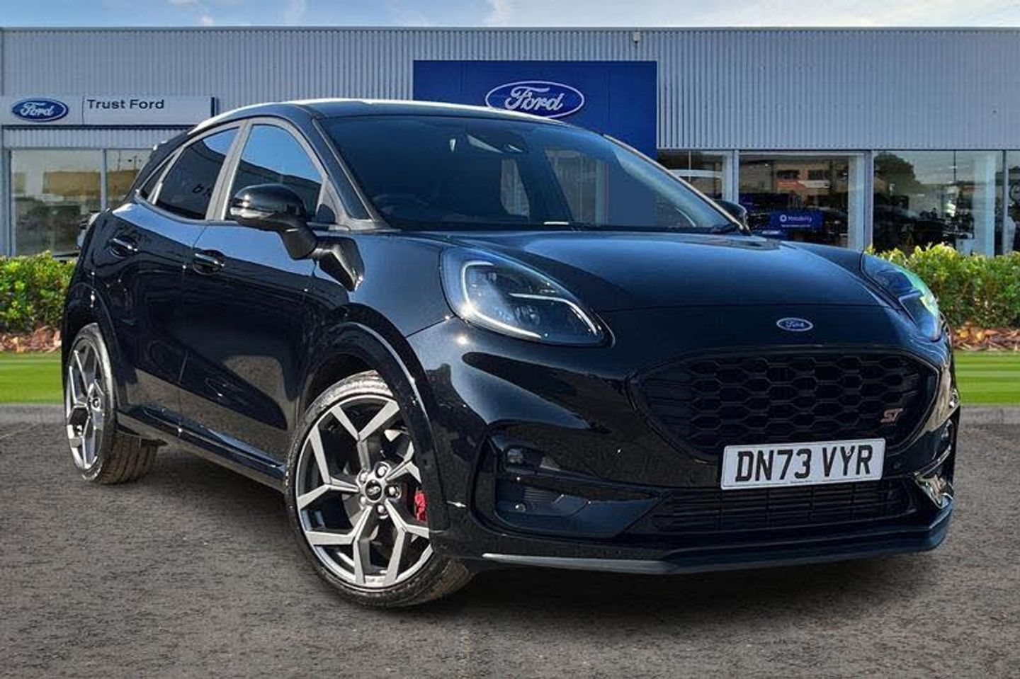 Cruise control with Intelligent speed assist, Driver impairment monitor, Emergency call service, Ford easy fuel, Front and rear parking sensors, Full digital 12.3 instrument cluster, Lane keeping aid with lane departure warning, Power assist steering, Selectable drive modes (normal, sport, eco, track), Speed sign recognition, Automatic headlights with auto high beam, Automatic rain sensing wipers, Dual chrome exhaust, Fixed LED signature headlamps, Front fog lamps, LED daytime running lights, LED rear lamps, Power foldable heated door mirrors with puddle lamps and puma logo protection, Privacy glass to side rear windows and tailgate glass, Quickclear heated windscreen, Rear side wing doors, Rear wiper, ST scuff plates, Third brake light, Unique ST body styling kit including wing mirrors and Ford Performance embossed splitter, 3 seat bench in 2nd row, Alloy sports pedals, Centre console with armrest and stowage, Ford megabox extended bootspace, Ford Performance sensico partial premium leather upholstery with metal grey stitching, Front and rear floor mats, Front and rear head restraints, Manual 6 way driver seat adjust with lumbar adjustment, Manual 6 way passenger seat with lumbar seat adjustment, Single front passenger seat, ST flat bottomed steering wheel with metal grey stitching, ST logo projection, Unique ST gear shift knob, Wireless charging pad with electronic air temperature control (EATC), 3 rear seatbelts, Child safety lock, Electronic stability control (ESC) and hill start assist, Pedestrian/cyclist detection & post-collision braking, Pre collision assist system, Red brake calipers, Tyre pressure monitoring system (TPMS)