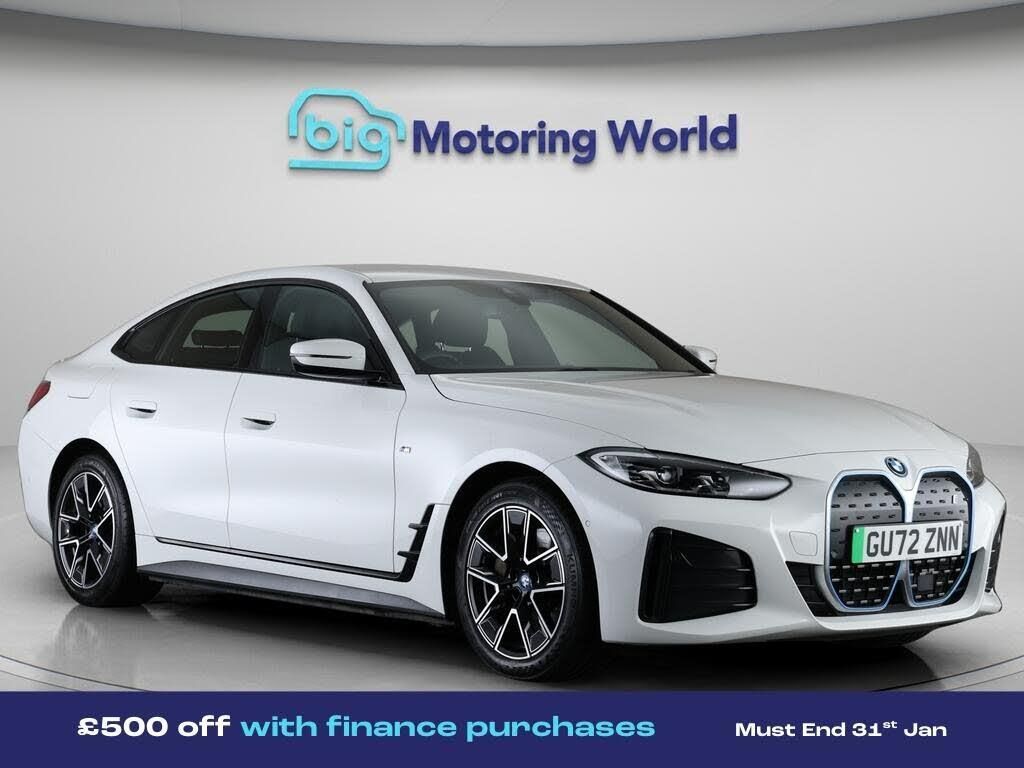 £500 towards your finance depo-Our BMW i4 is finished in White. Specification includes a range of fantastic features including £500 towards your finance deposit, 18'' alloy wheels, Leather Seats, Connected Package Professional, M Sport Exterior Styling Pack, M Sport Bodykit, Heated Seats, Gesture Tailgate, Rear View Camera, Internet Specification information is supplied by CAPHPI and may vary to the actual car. This data does not form any part of a buying contact. Please check specification prior to purchase in-store. The MOT is valid until November 2026, visit bigmotoringworld.co.uk for more photos, a 360 tour, service history and a free HPI report.Were BIG on peace of mind and this White BMW i4 has completed our comprehensive 200 point inspection and passed all checks. Its ready for you to drive away with immediate collection in-store. We include a 90-day warranty as standard plus an option to extend for up to 3 years.Reserve this car exclusively for you, safely and securely at bigmotoringworld.co.uk, with a fully refundable £99 deposit. Test drive before you buy, with no commitment, no hassle and a completely haggle free experience. Still searching and want to see thousands more cars? We are BIG on choice with over 8000 cars to choose from.Visit our award winning web site bigmotoringworld.co.uk.Were Big Motoring World and were BIG on what matters to you.