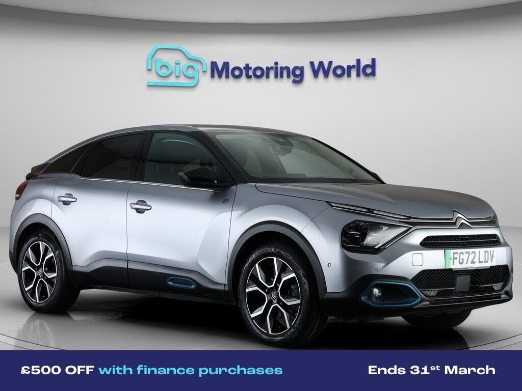 £500 towards your finance depo-Our Citroen e-C4 is finished in Grey. Specification includes a range of fantastic features including £500 towards your finance deposit, Head up Display, 18'' alloy wheels, Leather Seats, Privacy Glass, Heated Seats, Rear View Camera, Heated Steering Wheel, Bluetooth, Blind Spot Assist Specification information is supplied by CAPHPI and may vary to the actual car. This data does not form any part of a buying contact. Please check specification prior to purchase in-store. The MOT is valid until September 2026, visit bigmotoringworld.co.uk for more photos, a 360 tour, service history and a free HPI report.Were BIG on peace of mind and this Grey Citroen e-C4 has completed our comprehensive 200 point inspection and passed all checks. Its ready for you to drive away with immediate collection in-store. We include a 90-day warranty as standard plus an option to extend for up to 3 years.Reserve this car exclusively for you, safely and securely at bigmotoringworld.co.uk, with a fully refundable £99 deposit. Test drive before you buy, with no commitment, no hassle and a completely haggle free experience. Still searching and want to see thousands more cars? We are BIG on choice with over 8000 cars to choose from.Visit our award winning web site bigmotoringworld.co.uk.Were Big Motoring World and were BIG on what matters to you.