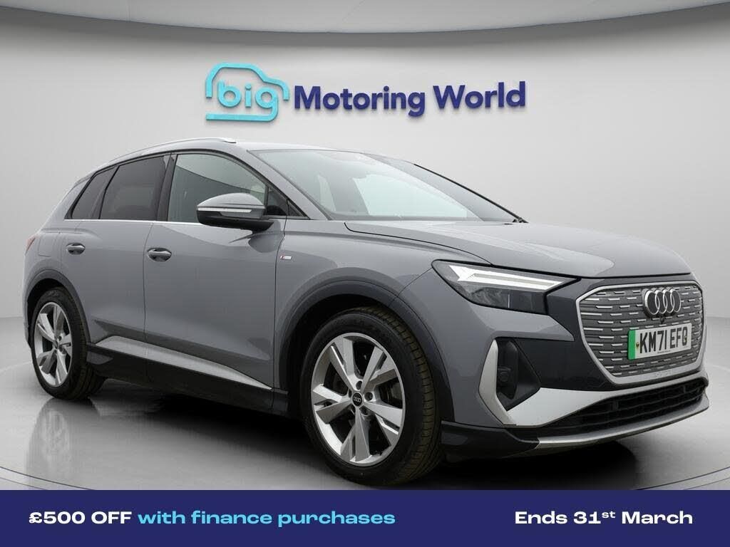 £500 towards your finance depo-Our Audi Q4 e-tron is finished in Grey. Specification includes a range of fantastic features including £500 towards your finance deposit, Part Leather Seats, Apple CarPlay, Lane Assist, S Line Body Styling, Android Auto, Satellite Navigation, Privacy Glass, Heated Seats, Bluetooth Specification information is supplied by CAPHPI and may vary to the actual car. This data does not form any part of a buying contact. Please check specification prior to purchase in-store. The MOT is valid until January 2027, visit bigmotoringworld.co.uk for more photos, a 360 tour, service history and a free HPI report.Were BIG on peace of mind and this Grey Audi Q4 e-tron has completed our comprehensive 200 point inspection and passed all checks. Its ready for you to drive away with immediate collection in-store. We include a 90-day warranty as standard plus an option to extend for up to 3 years.Reserve this car exclusively for you, safely and securely at bigmotoringworld.co.uk, with a fully refundable £99 deposit. Test drive before you buy, with no commitment, no hassle and a completely haggle free experience. Still searching and want to see thousands more cars? We are BIG on choice with over 8000 cars to choose from.Visit our award winning web site bigmotoringworld.co.uk.Were Big Motoring World and were BIG on what matters to you.