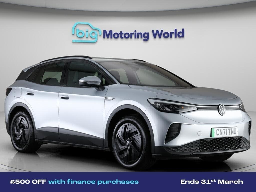 £500 towards your finance depo-Our Volkswagen ID.4 comes with optional extras worth £665. Specification includes a range of fantastic features including £500 towards your finance deposit, Comfort Pack, Part Leather Seats, Apple CarPlay, Adaptive Cruise Control, Android Auto, Satellite Navigation, Heated Seats, Internet, Bluetooth Specification information is supplied by CAPHPI and may vary to the actual car. This data does not form any part of a buying contact. Please check specification prior to purchase in-store. The MOT is valid until March 2027, visit bigmotoringworld.co.uk for more photos, a 360 tour, service history and a free HPI report.Were BIG on peace of mind and this Silver Volkswagen ID.4 has completed our comprehensive 200 point inspection and passed all checks. Its ready for you to drive away with immediate collection in-store. We include a 90-day warranty as standard plus an option to extend for up to 3 years.Reserve this car exclusively for you, safely and securely at bigmotoringworld.co.uk, with a fully refundable £99 deposit. Test drive before you buy, with no commitment, no hassle and a completely haggle free experience. Still searching and want to see thousands more cars? We are BIG on choice with over 8000 cars to choose from.Visit our award winning web site bigmotoringworld.co.uk.Were Big Motoring World and were BIG on what matters to you.