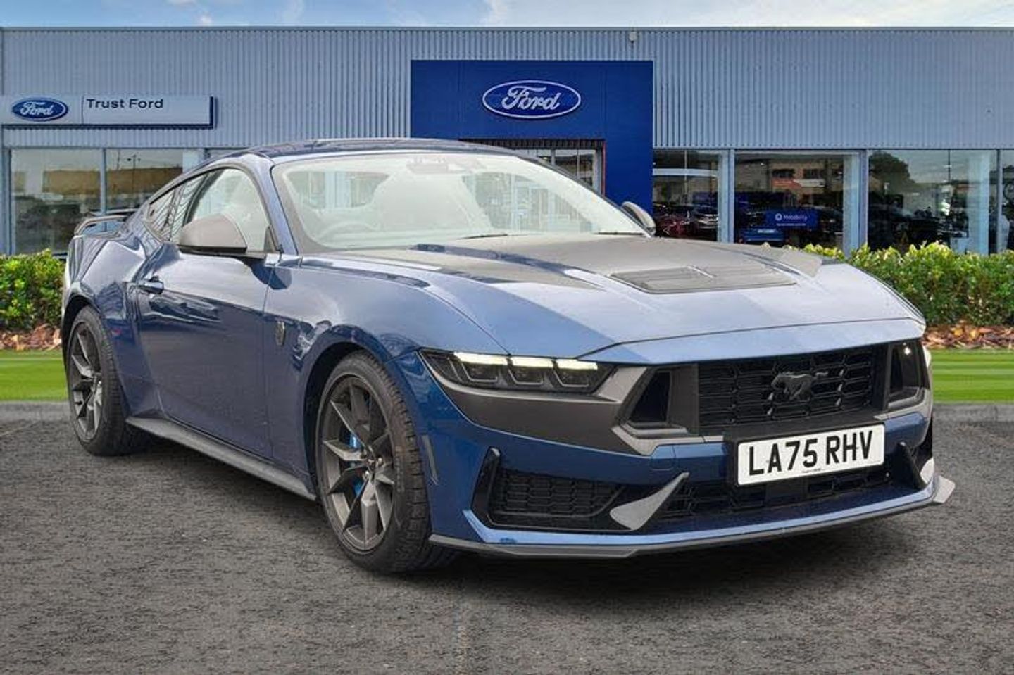 12 digital LCD instrument cluster, Adaptive cruise control with adjustable speed limiter, Apple car play/Android Auto, Bluetooth connectivity with voice control, Electric power steering, Emergency services call system, Ford pass connect embedded modem, Fully customisable 13.2 Touchscreen with wireless smartphone integration, FordPass connect & connected navigation, Lane keeping aid with lane keeping assist, Oil pressure gauge, Rear view camera with rear parking sensors, Selectable driving modes - normal, mymode, snow/wet, sport+, track and drag mode, Service interval indicator, SYNC Emergency Assistance, Track apps with accelerometer technology, Trip computer, Wireless charging and USB charging port, 3rd brake light, Active exhaust system with quad tailpipes, Auto dimming rear view mirror, Auto high beam, Automatic headlights, Automatic rain sensing wipers, Body colour bumpers, Body colour door mirrors, Bonnet air intake, Dark Horse front grille with dark pony badge, Dark Horse extrior badging and quad tailpipes in black, Dark Horse specific bodykit with exclusive aerodynamic enhancements, Dark Triple-LED headlamps with welcome / farewell animation, Electric front windows, LED daytime running lights, LED rear lights with sequential indicators and welcome / farewell animations, Power-folding door mirrors including blind spot informaion system and mustang logo projection puddle lamps, Rear boot, 6 way power adjustable front seats, Ambient lighting, Cup holders, Electronic automatic temperature control (EATC), Front headrests, Heated leather flat bottom steering wheel with blue stitching and Dark Horse badging, Illuminated entry system, Individually folding 2 rear seats in 2nd row, Isofix system on outer rear seats, Leather gearknob, Reach and rake adjustable leather steering wheel with integrated controls, Rear head restraints, Single front passenger seat, 4 seatbelts, ABS, Drivers knee airbag, Dual front airbags, Electronic Line Lock, Electronic Stability Control (ESC) with three settings, ESP, Front side airbags, Performance brake system with brembo 6 piston front callipers and electronic brake prefill, Pre-collision assist with AEB and pedestrian and cyclist detection, Side curtain airbags, Tyre pressure monitor