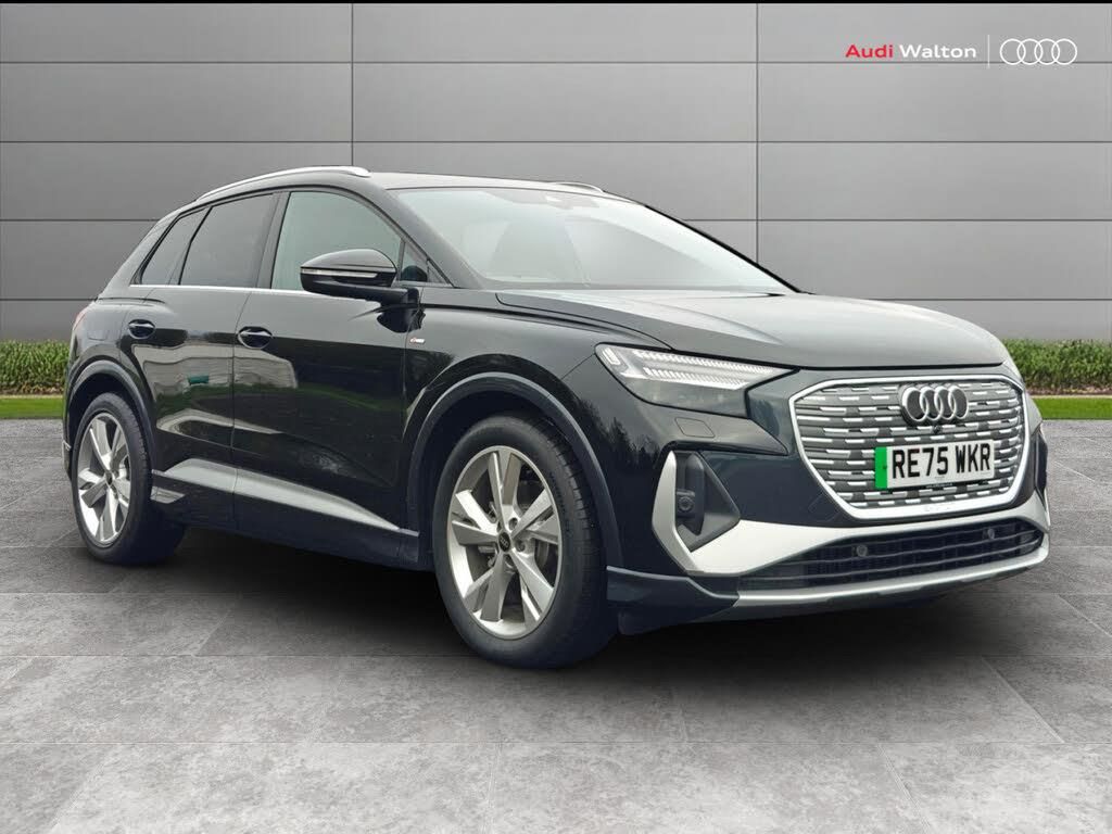 Adaptive cruise control with speed limiter, Advanced driver attention and drowsiness monitor, Audi application store, Audi connect safety and service (e-call), Audi drive select, Audi smartphone interface, Audi Virtual Cockpit - 10.25" display, Bluetooth interface, Camera based traffic sign recognition, Lane departure warning including emergency assist, MMI Navigation Plus with high resolution 11.6 inch touchscreen colour display, Power operated tailgate with sensor controlled release, Progressive steering, Rear view camera, Swerve assist and turn assist, 145kW DC charging capability, AC and DC charging access point positioned on driver's side rear, Control unit with household plug and charging cable, Mode 2, Type 2 / G (10A), Mode 3 type 2 AC charging cable 22kW, Sport suspension, 2 USB-C ports with charge and data functions, Audi sound system with 8 loudspeakers incl. centre speaker, subwoofer and 6-channel amplifier with total output of 180 watts, DAB Digital radio, Aluminium roof rails, Body coloured door mirrors, Contrast bumpers in Manhattan grey, Electrically adjustable/heated/folding/auto dimming door mirrors with integrated LED indications + kerb view function for passenger side, Frameless auto dimming interior rear view mirror, Heat insulating glass windscreen, Heated rear window, LED 3rd brake light, LED daytime running lights, LED Headlights, LED rear lights, Privacy glass - dark-tinted rear window, rear door windows and rear side windows, Projection light in the exterior mirrors, e-tron logo projected from the underside of the exterior mirror onto the ground, Rear side wing doors, Rear wiper, S Line badges on the front wings, S line exterior styling, Single frame grille with a structured, closed surface within an octagonal shape, 3 seat bench in 2nd row, 3 zone automatic air conditioning, 4 way electric lumbar support for driver and front passenger, 40/20/40 split folding rear seat bench, Accent surfaces in gloss black - centre console control panel, switch panel and trim on front doors in gloss black, Black carpets, Black cloth headlining, Comfort auxiliary air conditioning, Door armrests in leatherette, Front centre armrest, Front door sill trims with aluminium inlay, illuminated with S logo, Front sport seats with integrated head restraints, Front/rear floor mats, Heated front seats, Manual seat adjustment for driver and front passenger seats, Pedals in stainless steel, Rear centre armrest with cupholders, Rear head restraints, Single front passenger seat, Steering wheel with trim in chrome look, S emblem, steering wheel grips in perforated leather and contrast stitching, Ambient lighting plus pack - Q4 E-tron, Gloss styling pack - Q4 E-tron, Non smoking pack - Q4 E-tron, 3x3 point rear seatbelts, Acoustic vehicle alerting system, Convenience key with safelock, Driver and front passenger airbag with passenger airbag deactivation, Electric child locks, First aid kit with warning triangle and vests, Front side airbags with head airbag system and front interaction airbag, i - Size child seat mounting on the front passenger side and i - Size and top tether on the outer rear seats, Pre-sense front with pedestrian and cyclist detection, Rear seat occupant reminder for child presence detection, Seat belt monitoring, Tyre pressure loss indicator, Anti theft alarm, Anti-theft wheel bolts, Keyless Go, Aluminium look interior elements, Black dashboard, Vehicle tool kit with tyre repair kit