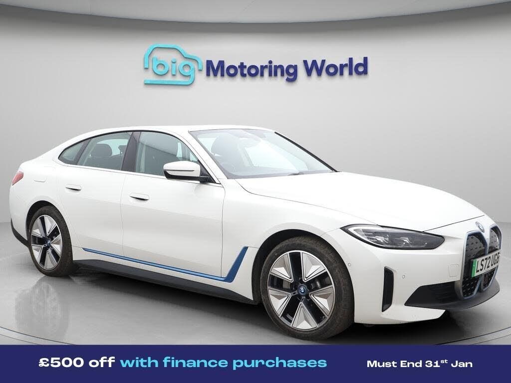 £500 towards your finance depo-Our BMW i4 comes with optional extras worth £950. Specification includes a range of fantastic features including £500 towards your finance deposit, 19'' Alloy wheels, Leather Seats, Apple CarPlay, Adaptive Cruise Control, Connected Package Professional, Android Auto, Satellite Navigation, Heated Seats, Gesture Tailgate Specification information is supplied by CAPHPI and may vary to the actual car. This data does not form any part of a buying contact. Please check specification prior to purchase in-store. The MOT is valid until November 2026, visit bigmotoringworld.co.uk for more photos, a 360 tour, service history and a free HPI report.Were BIG on peace of mind and this White BMW i4 has completed our comprehensive 200 point inspection and passed all checks. Its ready for you to drive away with immediate collection in-store. We include a 90-day warranty as standard plus an option to extend for up to 3 years.Reserve this car exclusively for you, safely and securely at bigmotoringworld.co.uk, with a fully refundable £99 deposit. Test drive before you buy, with no commitment, no hassle and a completely haggle free experience. Still searching and want to see thousands more cars? We are BIG on choice with over 8000 cars to choose from.Visit our award winning web site bigmotoringworld.co.uk.Were Big Motoring World and were BIG on what matters to you.