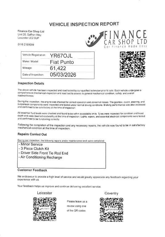 Fiat Punto 1.4 Pop+ Euro 6 (s/s) 5 DoorWell maintained Fiat Punto 1.4 Pop+ in excellent condition. A reliable, economical, and practical hatchback, perfect for commuting, first-time drivers, or everyday use.Key Details1.4 Petrol EngineManual GearboxEuro 6 (Stop/Start)5 Doors1 Lady Owner from NewPart Service HistoryFeaturesAir ConditioningElectric WindowsElectric MirrorsAlloy WheelsUSB / AUX InputBluetooth ConnectivityDrives smoothly with a reliable engine and gearbox. Clean inside and out, well looked after, and ready to drive away. Practical, comfortable, and very economical to run.+ 6 MONTHS WARRANTY INCLUDED + 6 MONTHS BREAKDOWN COVER + EXTENDED WARRANTY AVAILABLE + FINANCE OPTIONS AVAILABLE UPON REQUEST + DELIVERY CAN ONLY BE ARRANGED ONCE THE VEHICLE HAS BEEN VIEWED & INSPECTED IN PERSON AT OUR PREMISES + PHOTO ID IS REQUIRED FOR ALL VIEWINGS AND TEST DRIVES + WE CAN BE REACHED VIA WHATSAPP ON 07458 300017 FEEL FREE TO MESSAGE US + PLEASE NOTE, THE PRICE IS FIXED ON THIS VEHICLE. KINDLY BE AWARE OF THIS PRIOR TO ARRANGING A VIEWING + WE HAVE OVER 50 VEHICLES IN STOCK. AS NOT ALL VEHICLES ARE HELD ON SITE, PLEASE ENSURE YOU CALL IN ADVANCE BEFORE MAKING YOUR JOURNEY + BANK TRANSFER ONLY + MORE CARS AVAILABLE AT:WWW.FINANCECARSHOPLTD.CO.UK +-+SERVICE HISTORY+1 LADY OWNER+-+ WHATSAPP US ON 07458 300017 + OPEN 7 DAYS A WEEK + BANK TRANSFER ONLY + VIEWING BY APPOINTMENT +