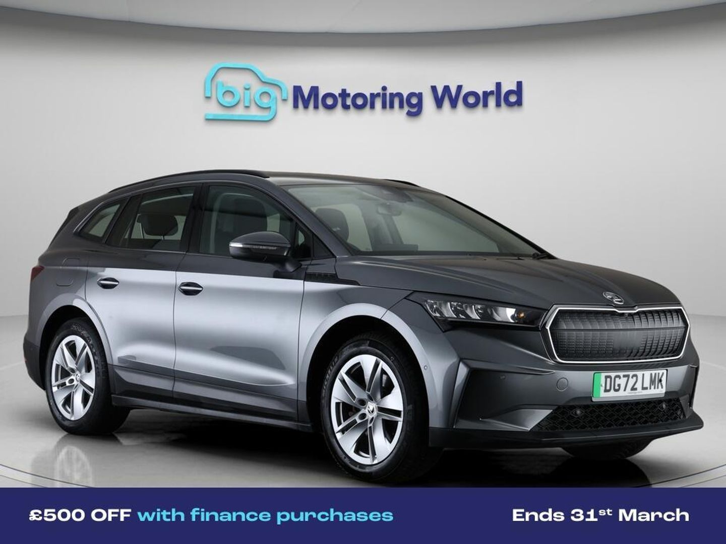 £500 towards your finance depo-Our Skoda Enyaq is finished in Grey. Specification includes a range of fantastic features including £500 towards your finance deposit, Leather Seats, Lane Assist, Heated Seats, Gesture Control, Bluetooth, Parking Sensors, Ambient Lighting, Wi-Fi Hot Spot Prep, 2 Zone Climate Specification information is supplied by CAPHPI and may vary to the actual car. This data does not form any part of a buying contact. Please check specification prior to purchase in-store. The MOT is valid until October 2026, visit bigmotoringworld.co.uk for more photos, a 360 tour, service history and a free HPI report.Were BIG on peace of mind and this Grey Skoda Enyaq has completed our comprehensive 200 point inspection and passed all checks. Its ready for you to drive away with immediate collection in-store. We include a 90-day warranty as standard plus an option to extend for up to 3 years.Reserve this car exclusively for you, safely and securely at bigmotoringworld.co.uk, with a fully refundable £99 deposit. Test drive before you buy, with no commitment, no hassle and a completely haggle free experience. Still searching and want to see thousands more cars? We are BIG on choice with over 8000 cars to choose from.Visit our award winning web site bigmotoringworld.co.uk.Were Big Motoring World and were BIG on what matters to you.