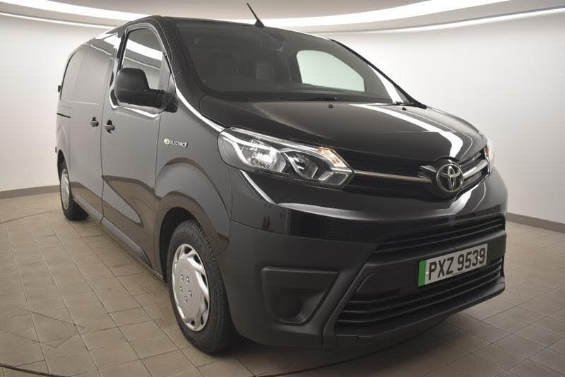 Cruise control, Driver seat armrest, PAS, 180 degree opening rear doors, Manual air conditioning, Rear window wiper, Height adjustable drivers seat, 4 speakers, 2 seat front passenger bench, Black door mirrors, Front door pockets, Front cup holders, Black door handles, Electric heated door mirrors, Digital radio (DAB), Cornering Lights, Daytime running lights, Electronic brake force distribution, Remote power door lock, Head up display, Smart cargo, Navigation system, 4 spoke urethane steering wheel, Auto wipers, Smoke tinted (30%) privacy glass on rear passenger window, Anti lock braking system (ABS), Vehicle stability control (VSC) and hill start assist control (HAC), Brake Assist (BA), Panel rear wing doors, Two manual sliding side doors, Rear parking sensors, Power adjustable door mirrors, Power retractable door mirrors, Adjustable speed limiter (ASL), Bluetooth handsfree connectivity, USB connector, Wifi connectivity, Auto Headlights, Multi reflector halogen headlights, Fabric seats, LED Driver and front passenger personal lights, Open upper dashboard storage compartment, 16 5 triple spoke steel wheels with wheel caps, Electronic parking brake, Black front and rear bumpers, Panel bulkhead with window and protective grille, Tyre pressure warning system (TPWS), Manually adjustable day/night rear view mirror, Glovebox light, Front room lights, Supplement restraint system (SRS) 2 airbags, Adjustable lumbar support on drivers seat, Manually reclining and sliding driver and front passenger seats, Front power windows, Driver and front passenger airbags, Analogue speedometer, Key starting system, Toyota Pro touch 7 inch screen with multimedia system, 7kW On Board Charger, Smart phone integration with Android auto & Apple CarPlay, Full size temporary spare wheel, Auto up and down on power window, e call emergency call system, Battery capacity indicator, Eco driving indicator, Additional digital speedometer in multi-information display, Colour EV 3.5 multi-information display screen, Information display switches behind steering wheel, Black insert on upper front grille, Noise reduction layer on windscreen, Single compartment glovebox, Electric consumption indicator, Electric system status indicator, Cargo area room lights x2, Drive mode selector, Telephone switches on steering wheel, Anti tamper, glass breaking sensors, intrusion and motion sensor alarm, 12v power socket - D pillar, 12v power outlet - Cargo area, 12v power outlet - Front