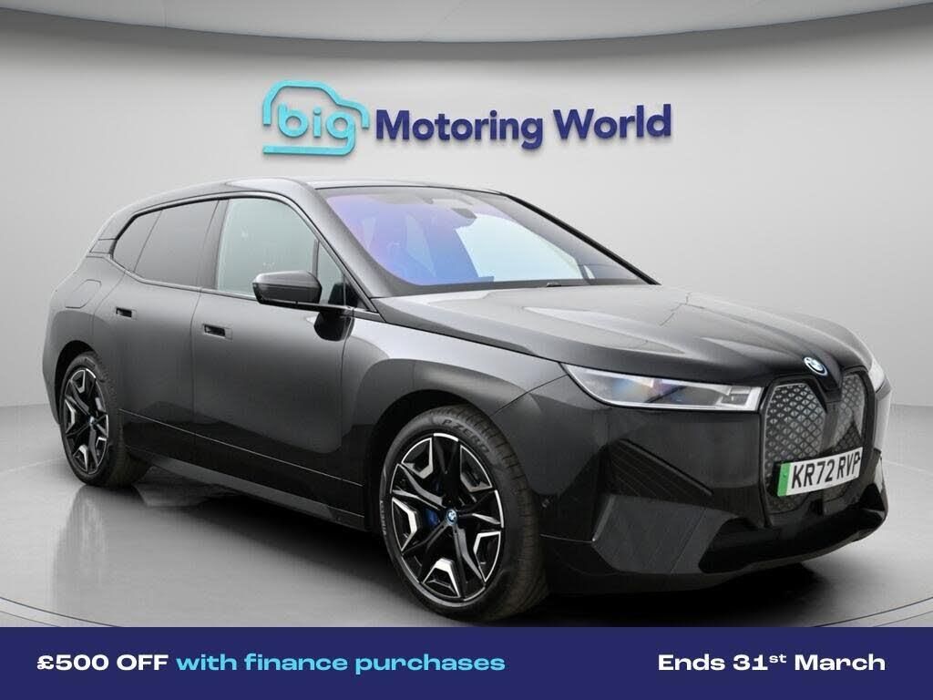 £500 towards your finance depo-Our BMW iX comes with optional extras worth £6,680. Specification includes a range of fantastic features including £500 towards your finance deposit, Panoramic Roof, All Wheel Drive, Sun Protection Pack, Head up Display, Leather Seats, Electric Seats, Harman Kardon Speakers, Soft Close Doors, Connected Package Professional Specification information is supplied by CAPHPI and may vary to the actual car. This data does not form any part of a buying contact. Please check specification prior to purchase in-store. The MOT is valid until February 2027, visit bigmotoringworld.co.uk for more photos, a 360 tour, service history and a free HPI report.Were BIG on peace of mind and this Black BMW iX has completed our comprehensive 200 point inspection and passed all checks. Its ready for you to drive away with immediate collection in-store. We include a 90-day warranty as standard plus an option to extend for up to 3 years.Reserve this car exclusively for you, safely and securely at bigmotoringworld.co.uk, with a fully refundable £99 deposit. Test drive before you buy, with no commitment, no hassle and a completely haggle free experience. Still searching and want to see thousands more cars? We are BIG on choice with over 8000 cars to choose from.Visit our award winning web site bigmotoringworld.co.uk.Were Big Motoring World and were BIG on what matters to you.