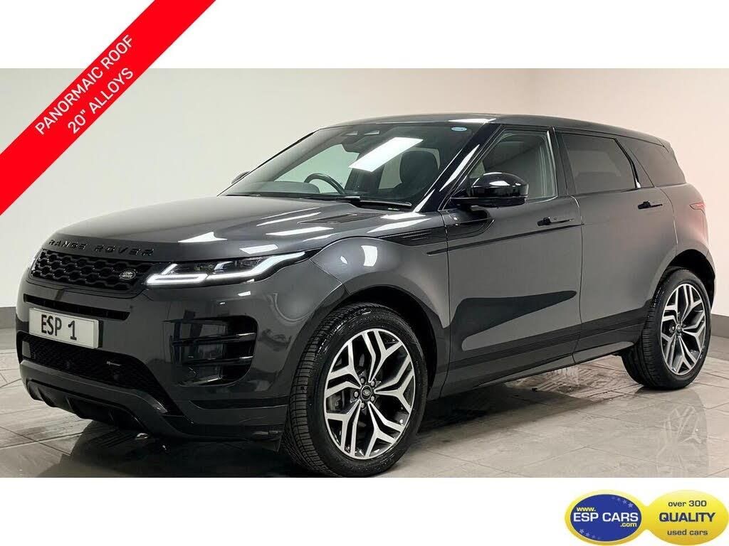 10in Deployable Touchscreen with Lower Touchscreen, Android Auto, Apple CarPlay, Bluetooth Connectivity, DAB - Digital Audio Broadcast, Meridian Surround Sound System, Online Pack with Data Plan, Pivi Pro - Connected, Power Socket Pack 1, Remote, Secure Tracker (12 Month Subscription From New), Wireless Device Charging, ACC - Adaptive Cruise Control, ATPC - All Terrain Progress Control, Blind Spot Assist, Brake Pad Wear Indicator, Configurable Dynamics, Driver Condition Monitor, Efficient Driveline, Front and Rear Parking Aid, Rear Collision Monitor, Rear View Camera, Terrain Response 2, TPMS - Tyre Pressure Monitoring System, Traffic Sign Recognition and Adaptive Speed Limiter, 20in Alloy Wheels - Style 5079 - Diamond Turned with Gloss Dark Grey Contrast, All Season Tyres, Animated Directional Indicators, Body Coloured Roof, Electric Windows with One-Touch Open-Close and Anti-Trap, Evoque Badge, Fixed Panoramic Roof Including Powered Blind, Flush Deployable Door Handles, Heated Electric Power Fold Door Mirrors with Approach Lights and Auto-dimming Driver Side, Heated Rear Window with Timer, Locking Wheel Nuts, R-Dynamic Exterior Pack, Rear Fog Lights, Tailgate Spoiler, Windscreen - Heated, Windscreen Washer Jets - Heated, Approach Lights, Automatic Headlight Levelling, Automatic Headlights, Headlights - Automatic High Beam Assist, Premium LED Headlights with Signature DRL, 14-Way Heated Electric Seats with Driver Memory and 2-Way Manual Headrests, 40-20-40 Folding Rear Seats, Ambient Interior Lighting, Analogue Dials with Central TFT Display, Auto-Dimming Interior Rear View Mirror, Bright Metal Pedals, Cabin Lighting, Carpet Mats, Chrome Treadplates, Extended Leather Upgrade, Headlining - Ebony Morzine, Manually Adjustable Steering Column, Overhead Lighting Console, Overhead Stowage for Sunglasses, Passive Front Headrests, Perforated Full Leather Steering Wheel, Powered Tailgate, Push Button Start, Rain Sensing Windscreen Wipers, Rear Air Vents, Rear Centre Headrest, Satin Chrome Gearshift Paddles, Steering Wheel - Heated, Sun Visors - Illuminated Vanity Mirrors, Trim Finish - Gradated Linear Dark Aluminium, Twin Sliding Front Centre Armrest, Two-Zone Climate Control, EPAS - Electronic Power Assisted Steering, Passive Suspension, ABS - Anti Lock Braking System, Customer Configurable Autolock, DSC - Dynamic Stability Control, EBA - Emergency Brake Assist, EBD - Electronic Brake-Force Distribution, Electric Parking Brake, Emergency Braking, ETC - Electronic Traction Control, HDC - Hill Descent Control, Hill Launch Assist, Intrusion Sensor, Keyless Entry, Lane Keep Assist, Low Traction Launch, Power Operated Child Locks, Rear ISOFIX, Rear Traffic Monitor, RSC - Roll Stability Control, Seat Belt Reminder, Six Airbags, TVBB - Torque Vectoring by Braking, Carpathian Grey