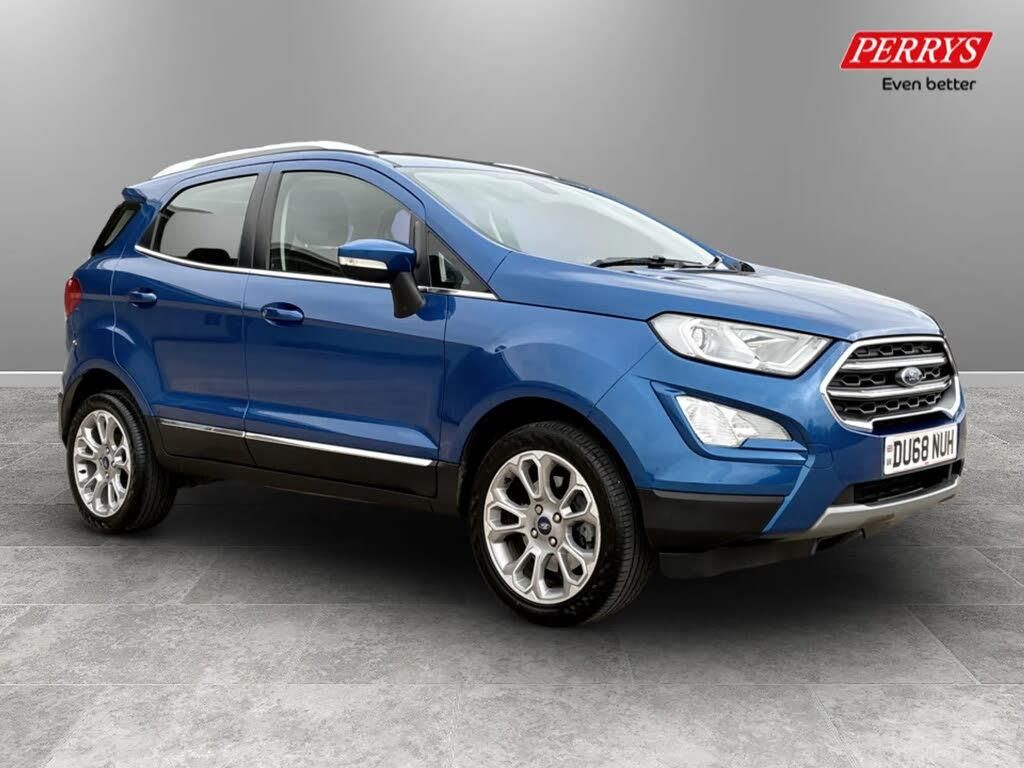 Cruise control,Easy fuel capless refuelling system,PAS,SYNC 3 nav system with DAB radio, 8" screen, voice control, emergency assistance, Apple car play/Android auto, 2x USB, Ford pass connect,Trip computer,'Quickclear' heated windscreen/heated washer jets,Auto dimming rear view mirror,Automatic headlights,Body colour door handles,Body coloured bumpers,Electrically adjustable and heated door mirrors,Front door threshold plates,Front fog lights,Front grille with chrome trim surround,Headlamps with LED day running lights,Headlight levelling control,Power foldable door mirrors with puddle lights,Power front and rear windows with global opening/closing,Rain sensing front wipers,Rear wiper,Silver roof rails,12V socket in front and rear,60/40 split rear seats,7 shade adjustable ambient lighting,Centre console with sliding front armrest,Cooled glovebox,Courtesy lights with map reading light,Driver seat height/lumbar adjust,Driver's side glovebox,Driver/passenger sunvisors and lidded vanity mirrors,EATC - Electronic Auto Temperature control,Folding grab handles,Front head restraints,Front seat back map pockets,Front/rear floor mats,Groove cloth/leather upholstery,Illuminated glovebox,Illuminated luggage compartment,Isofix system on outer rear seats,Leather gear knob and handbrake grip,Leather steering wheel with audio controls,Luggage compartment carpet,Overhead console with sunglasses holder,Rake adjustable rear seats,Reach + rake adjustable steering column,Rear headrests,Steering wheel with chrome inserts,Storage drawers under front seats,Tie down hooks,Variable boot floor,Rear view camera pack - Ecosport,3x3 point rear seatbelts,ABS,Child locks on rear doors,Curtain airbags,Driver airbag,Drivers knee airbag,Electronic Stability Programme with hill launch assist,Emergency brake assist,Front passenger airbag deactivation,Front side airbags,Passenger airbag,Seatbelt reminder for driver and front passenger,Traction control,Tyre pressure monitoring system,Immobiliser,MyKey system,Remote central locking,Thatcham 1 volume sensing alarm,Tyre inflation kit