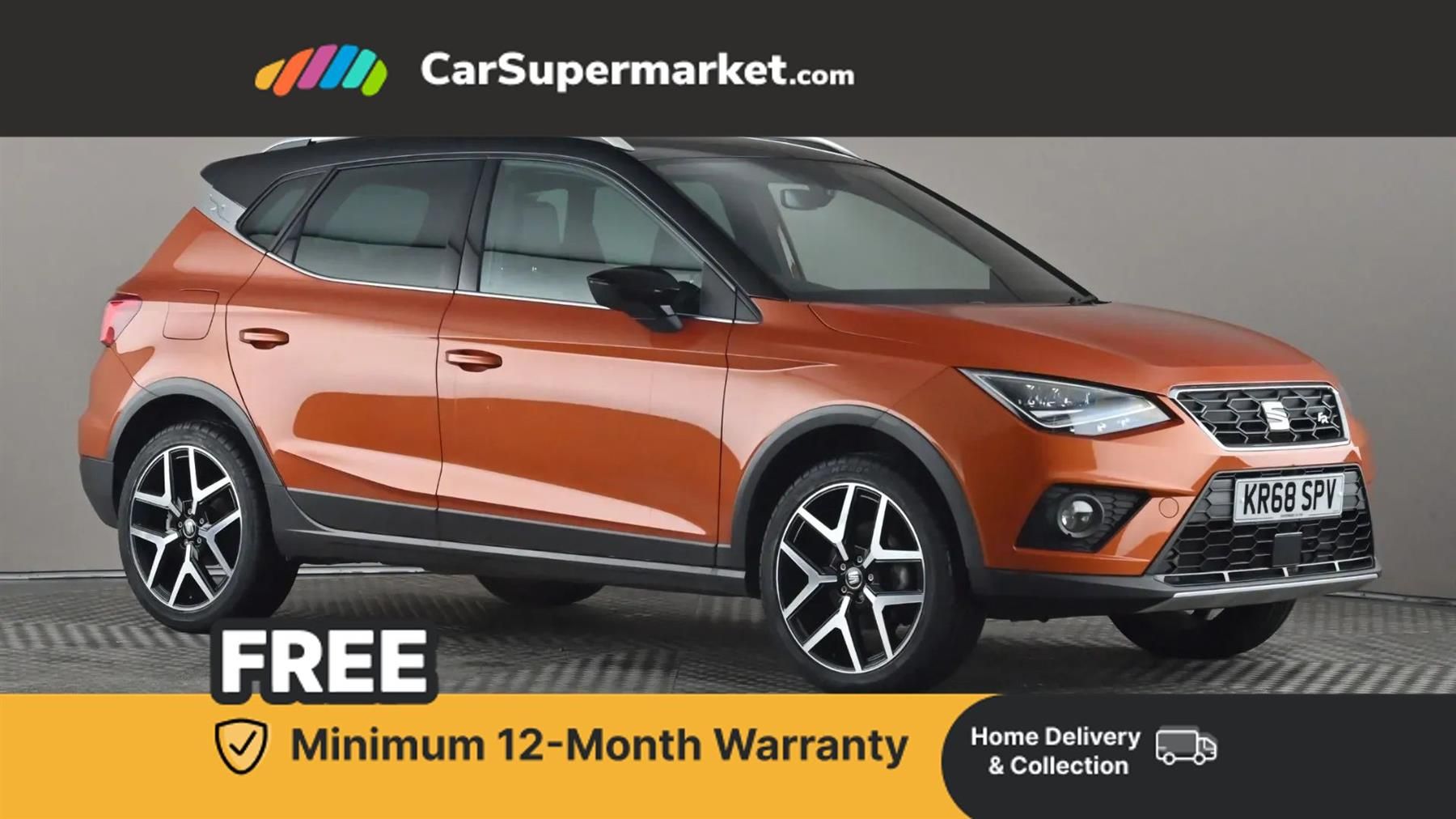 Cruise Control, Digital Cockpit, Android Auto, Apple CarPlay, Bluetooth, Digital Radio;SEAT Arona 1.0 TSI 115 FR Sport DSG (Orange) Sporty automatic crossover with digital cockpit display, Apple CarPlay, Android Auto, Bluetooth, cruise control and parking sensors. Also includes digital radio and stylish FR trim. Last serviced 9 March 2026, MOT due 8 March 2027.