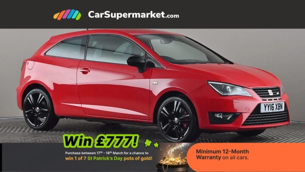 'Lights On' Reminder warning buzzer,Bluetooth system,Digital clock,Low fuel warning light,Outside temperature gauge,Satellite navigation system,SEAT Drive profile,SEAT logo boot release,Service interval indicator,Speed sensitive power steering,Trip computer,Sports suspension,XDS electronic differential lock,6 speakers,Auxiliary input socket,Digital Audio Broadcast (DAB) Tuner,Steering column with mounted audio controls,Auto dimming rear view mirror,Automatic headlights,Automatic rain sensing wipers,Bi-Xenon headlights with adaptive front light system + headlight washers,Body colour door handles,Centre trapezoidal exhaust pipe,Coming home headlight function,Cornering front fog lights,Dark tinted rear windows,Electric folding door mirrors,Electric headlight adjustment,Electrically adjustable and heated door mirrors,Exclusive Cupra front and rear bumpers,Gloss black door mirrors,High gloss black front grille,LED daytime running lights,LED tail lights,One touch electric front windows,Rear wiper,12V accessory power point in centre console,3 cupholders,Boot light,Climate control,Drilled aluminium pedals,Driver/passenger sunvisors and vanity mirrors,Dust/pollen filter,Easy entry and height adjustable passenger seat,Flat bottom sports leather steering wheel,Front courtesy lights,Front door pockets,Front reading lights,Front seat and rear pockets,Height adjustable driver's seat,Height adjustable front/rear head restraints,Height/reach adjust steering wheel,Illuminated glovebox,Isofix system on outer rear seats,Leather gear knob,Rear centre head restraint,Split folding rear seats,Driver pack - Ibiza,Full link media system pack - Ibiza,3 point seatbelts on all 3 rear seats,ABS,Active front headrests,Driver and passenger airbags,ESP+EBA+EDL,Front passenger airbag deactivation,Front side airbags,Multi-Collision braking,Seatbelt warning,Tyre pressure monitoring system,Deadlocks,Electronic engine immobiliser,Locking wheel bolts,Remote central locking,Volumetric alarm with back up horn,17" Barcino alloy wheels in black with red brake callipers,Space saver spare wheel
